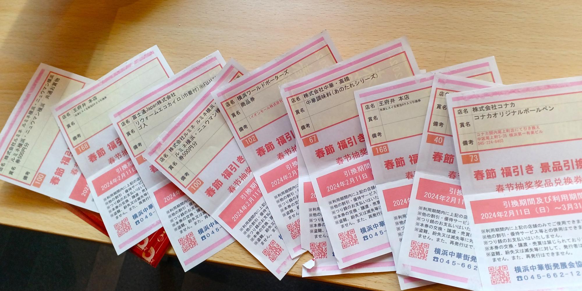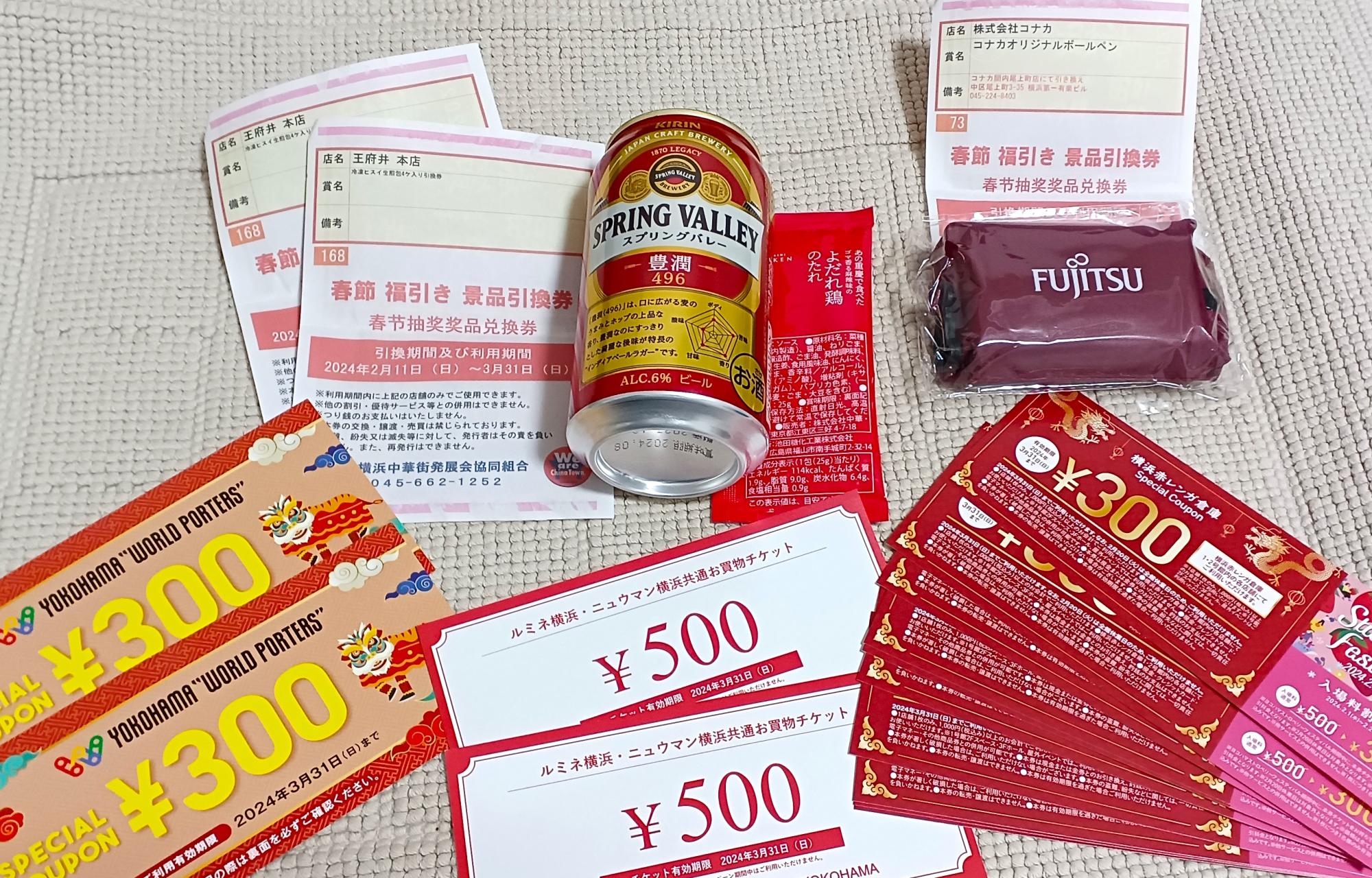写真左下の金券はワールドポーターズの300円商品券ルミネ横浜・ニュウマン横浜の500円商品券だ。筆者は過去の紅包くじで金券を当てたことがなかったため、この結果は意外だった。近隣の買い物で使えるのでありがたい。
