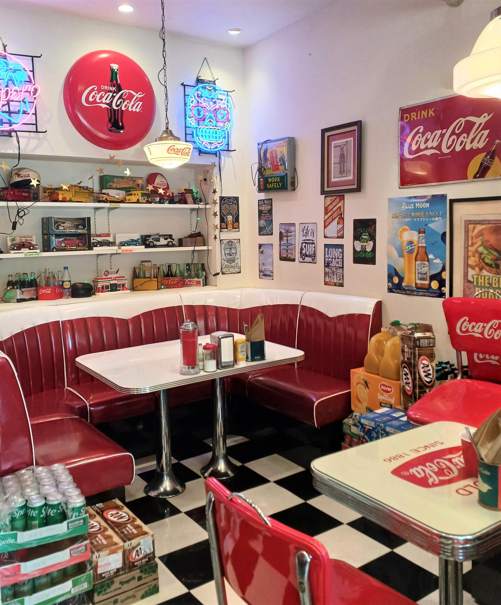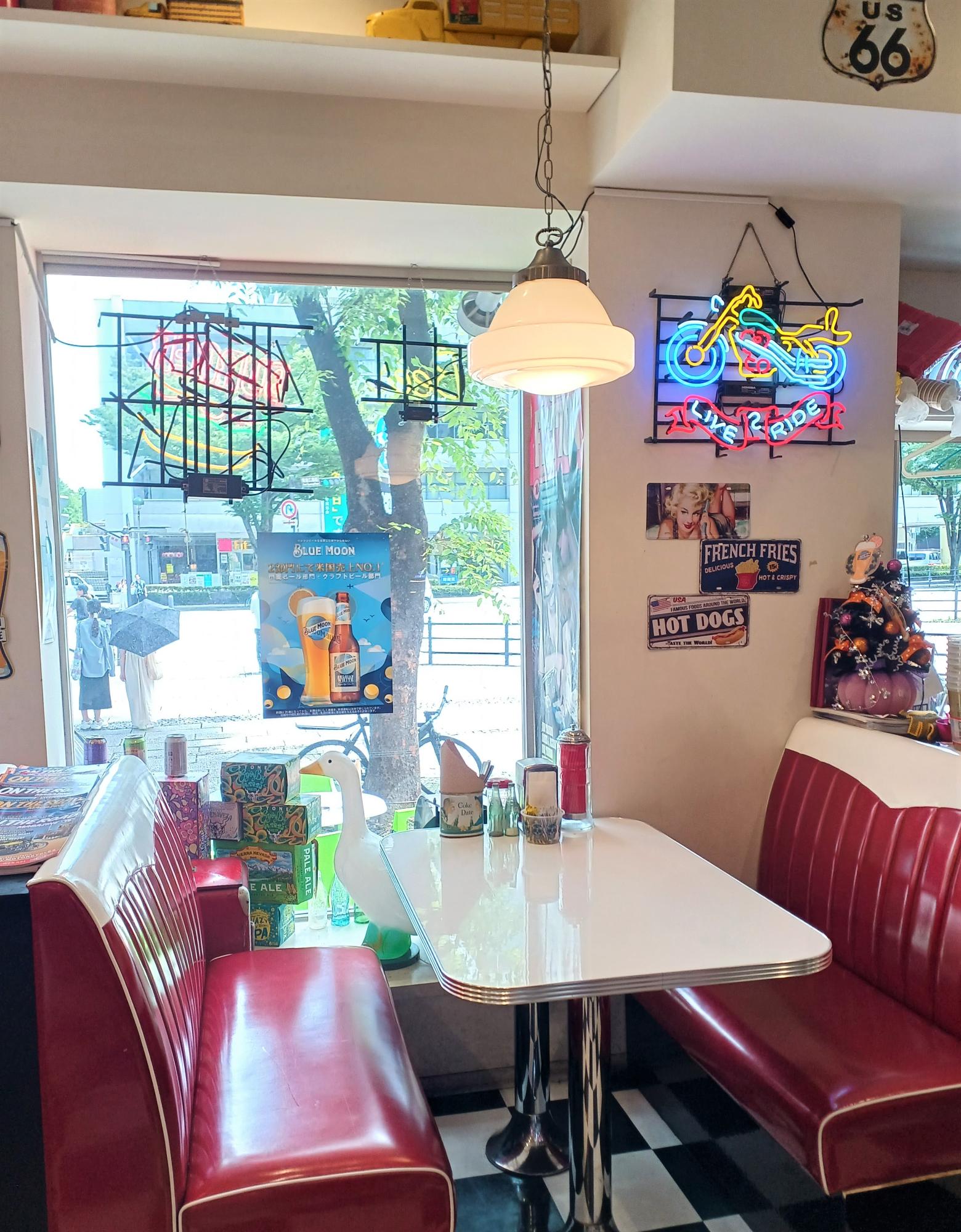赤を基調とした店内は明るく、アメリカンな装飾が鮮やか!一歩入ると楽しい気持ちになれるお店です。