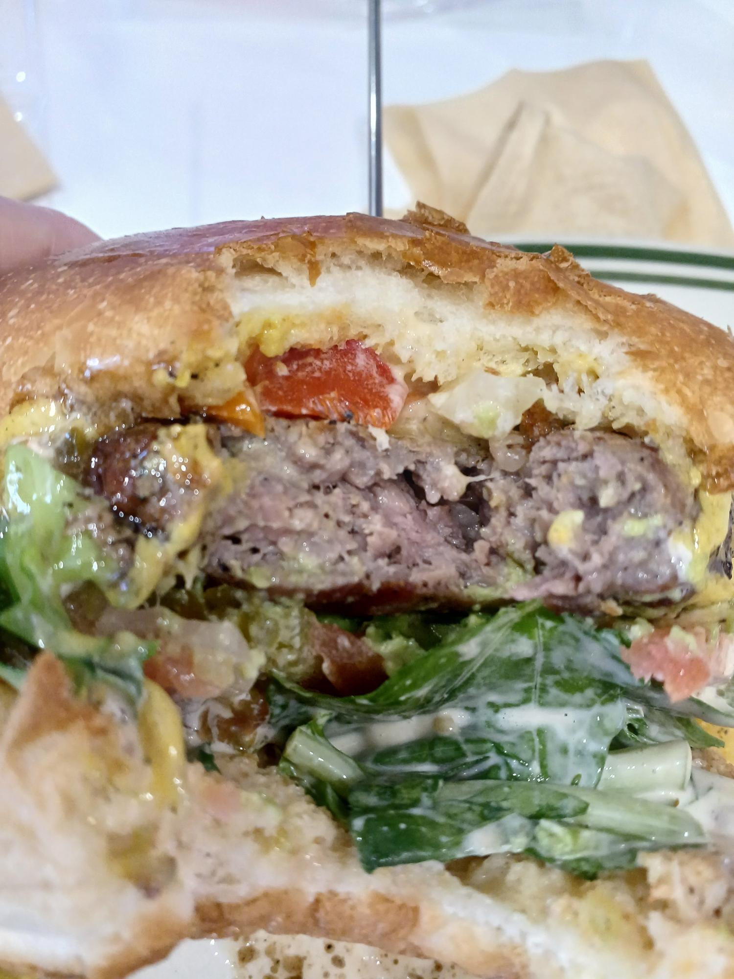 焼き加減も選択可能。お店のおすすめはミディアムですが、筆者の好みは硬め・よく焼きのため、ウェルダンで注文。ガブッといった断面御免!厚みがしっかりとあるパティ。バーガーをしっかりつぶして持ちますが…口をどれだけ大きく開けられるかが勝負だ!