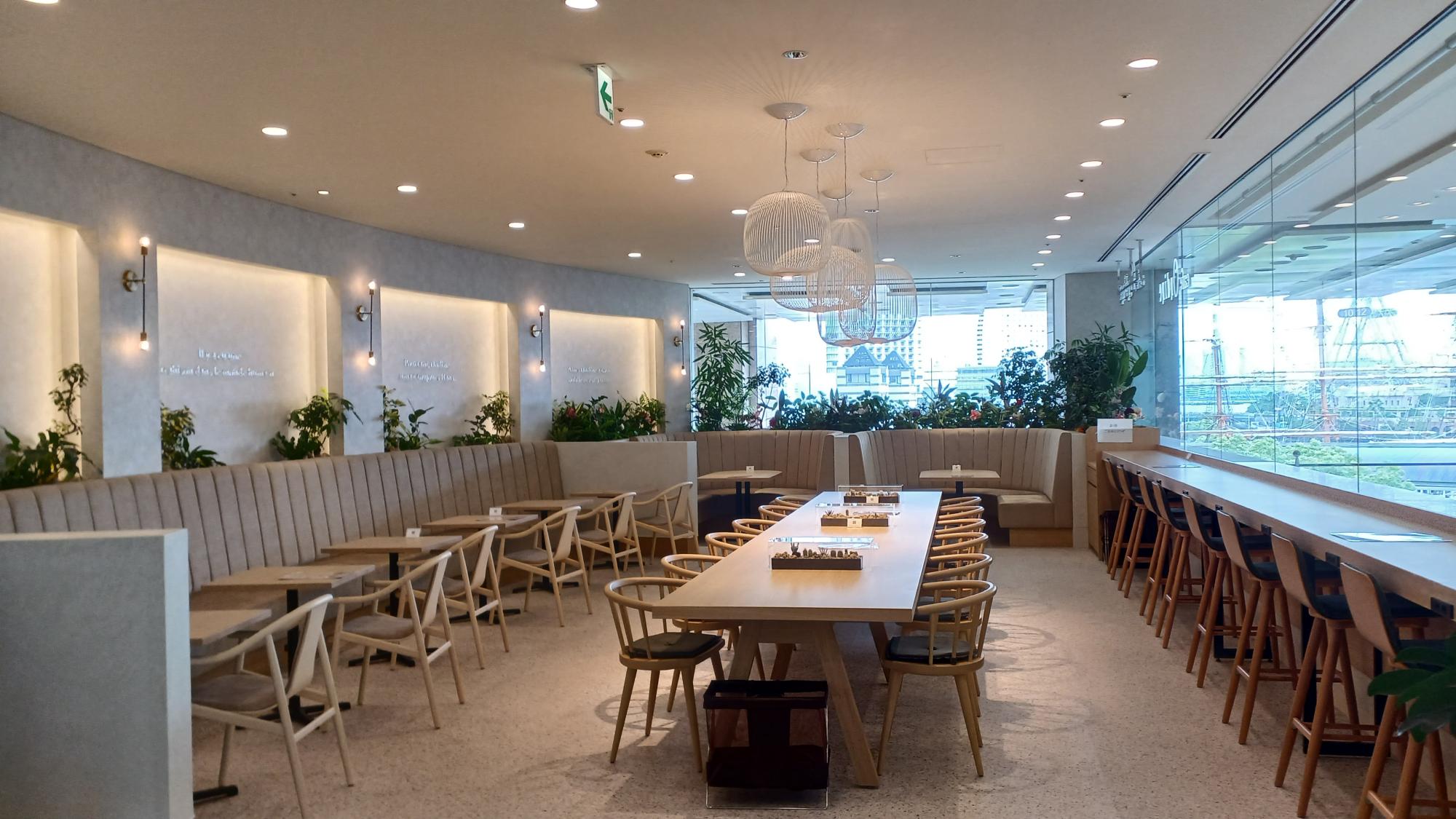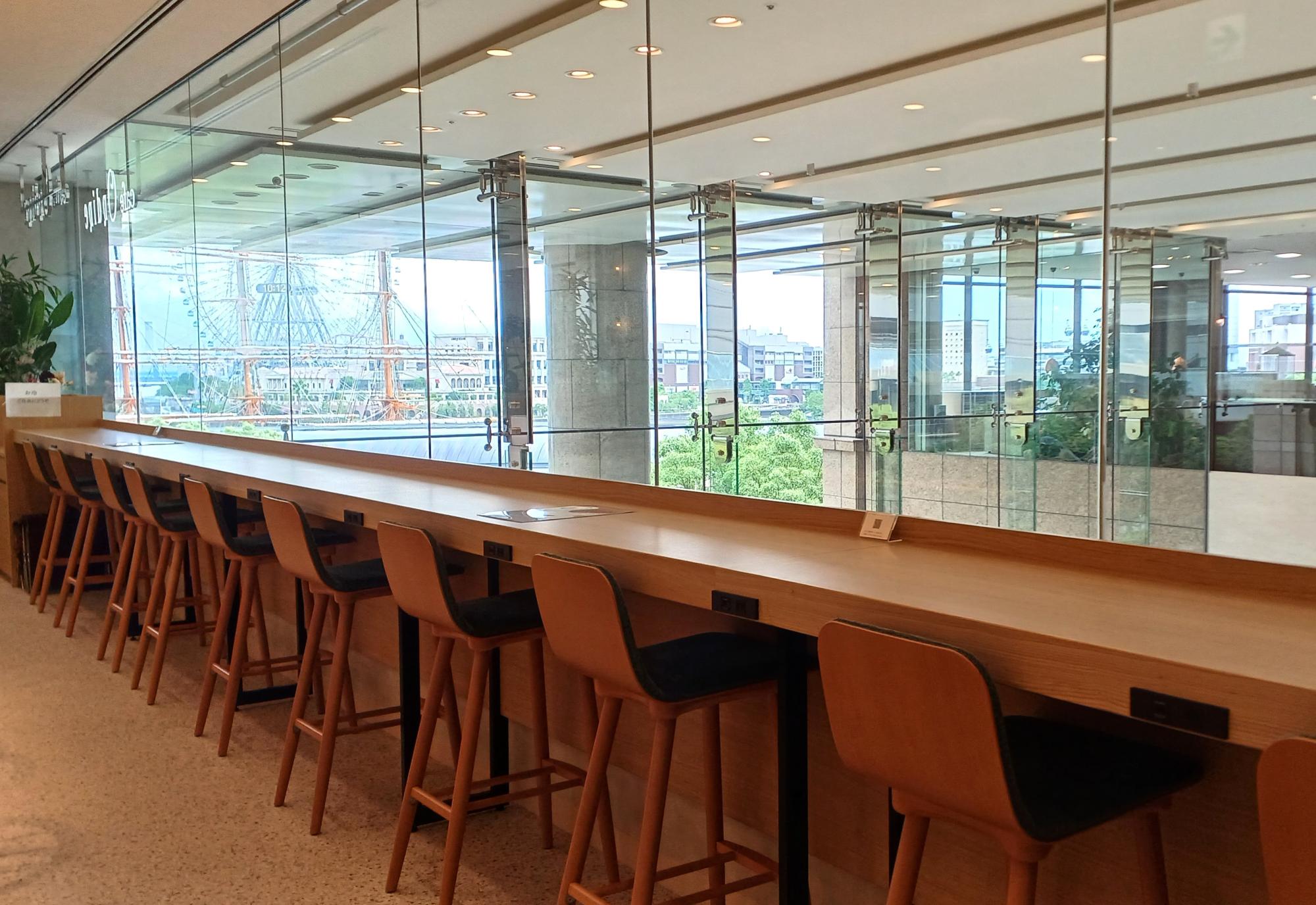 帆船日本丸のマストや、観覧車を眺めながら過ごせる席も。