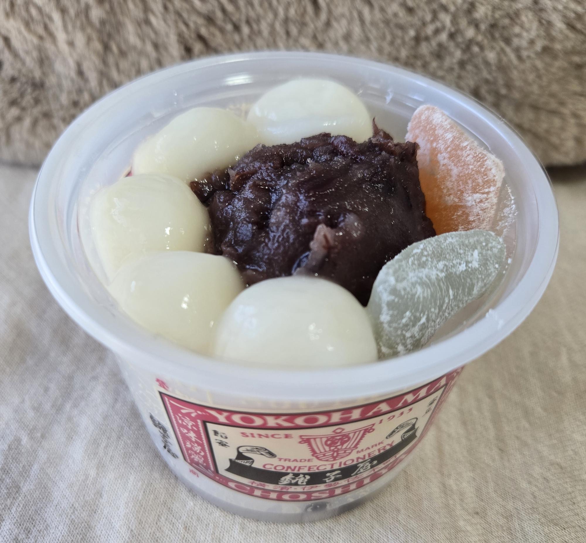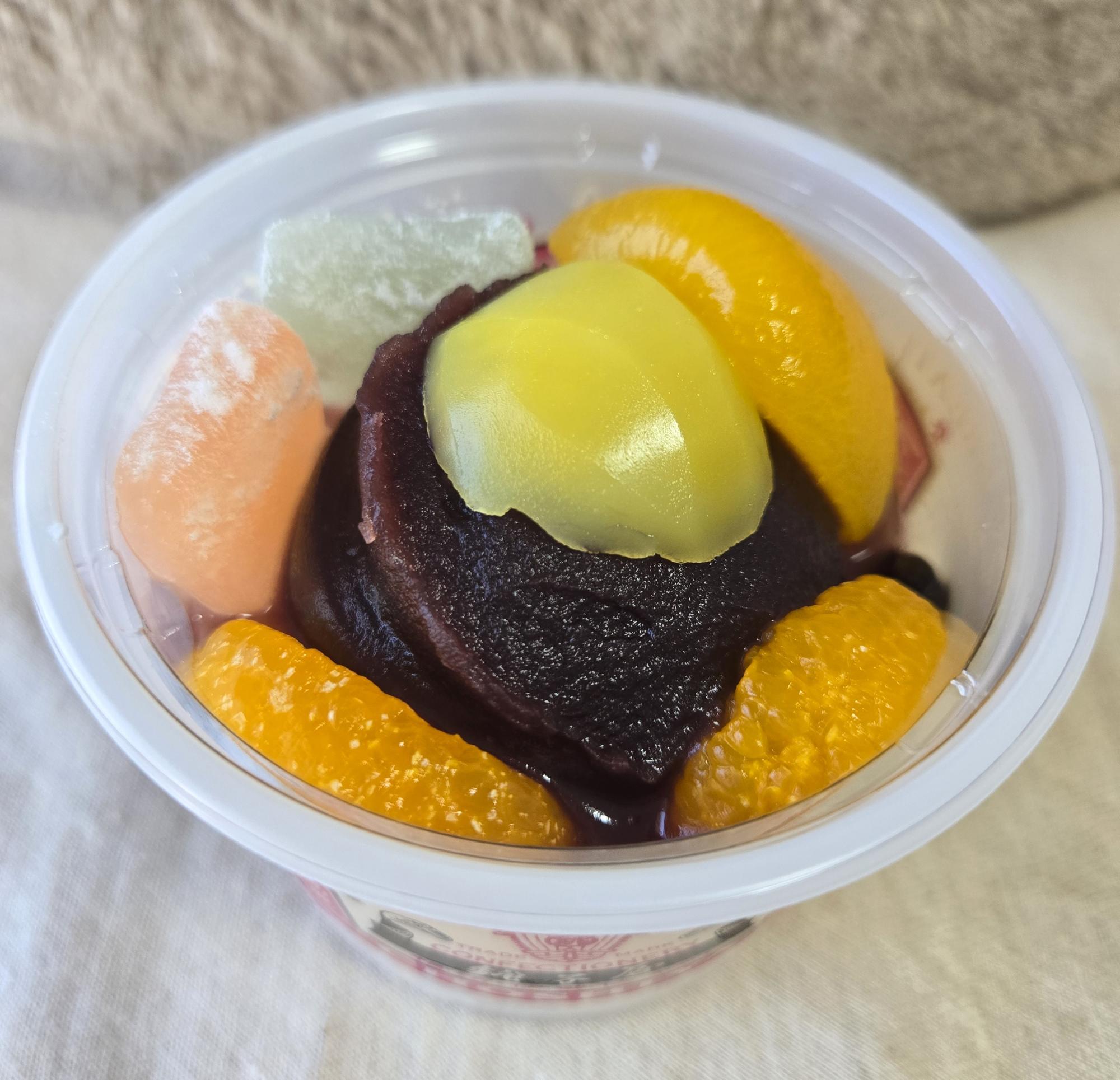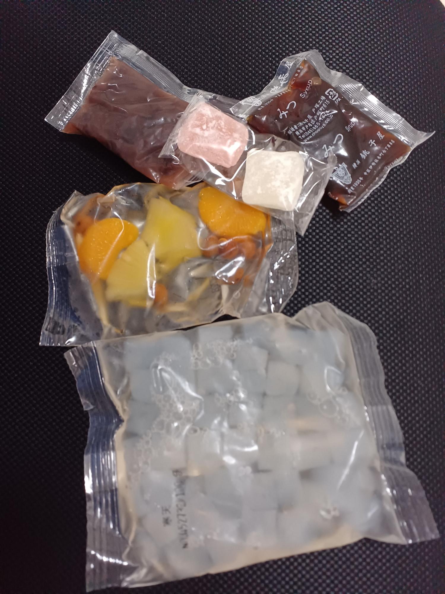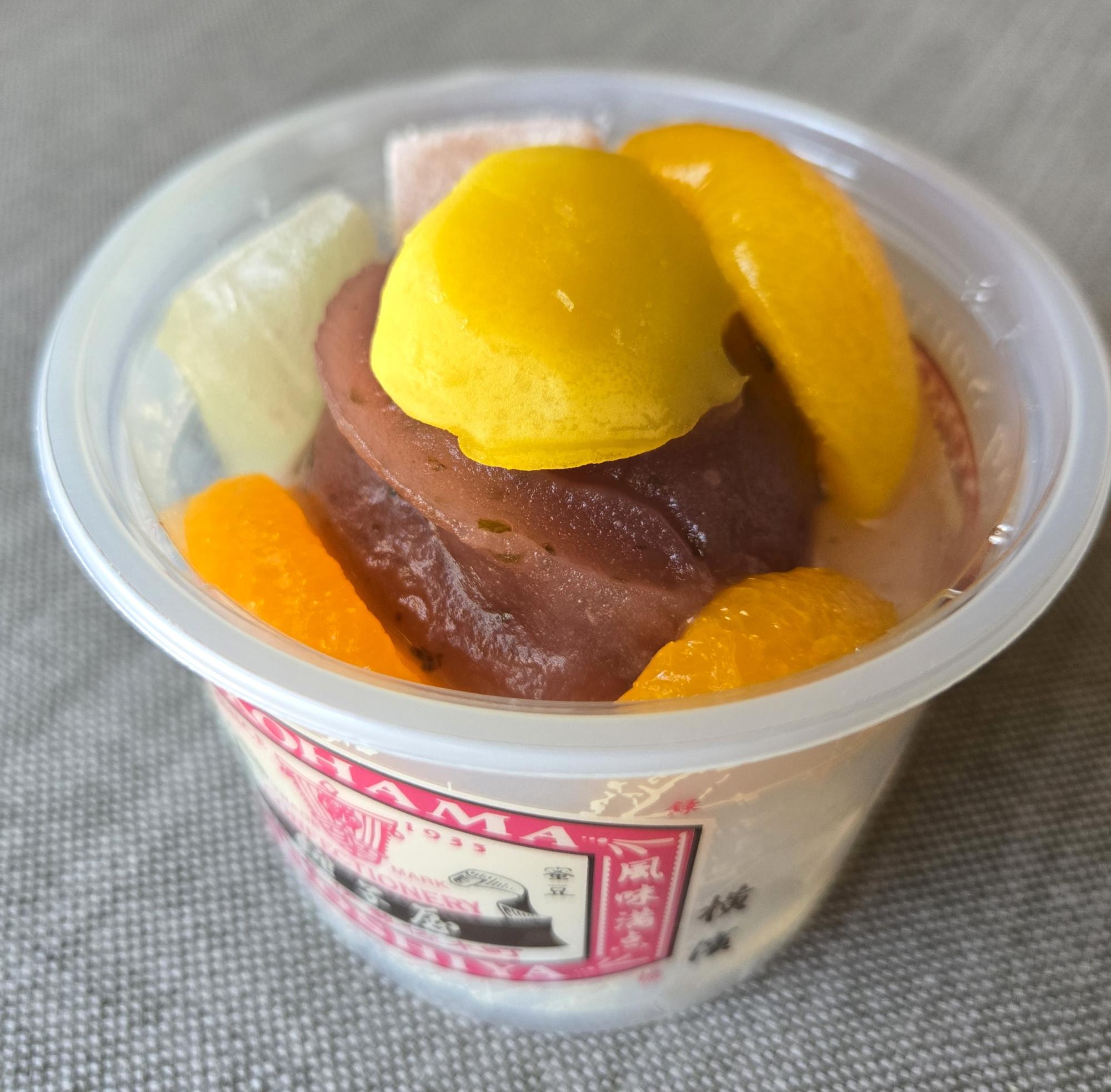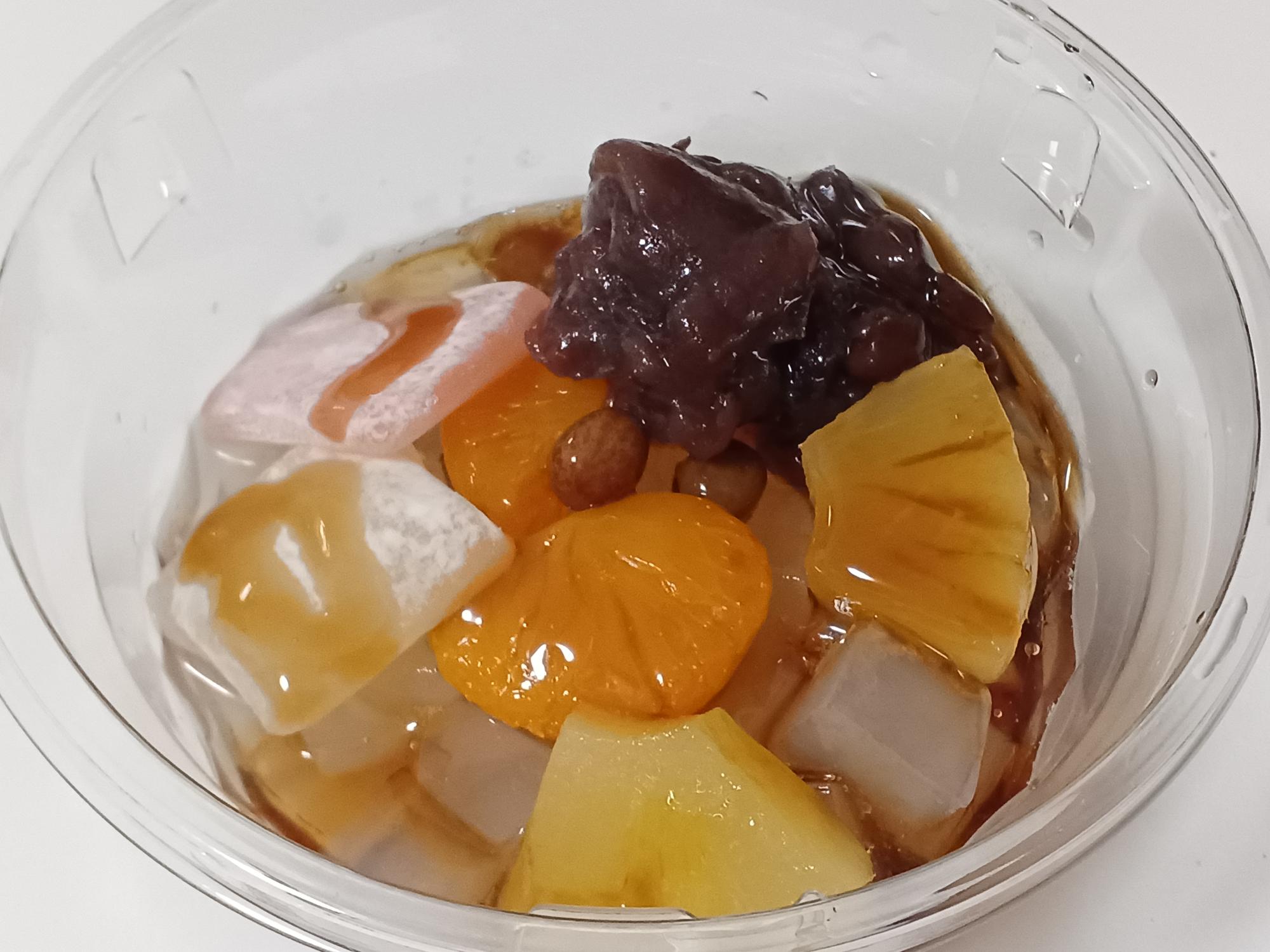 こちらは定番の「こし餡あんみつ」。フルーツと求肥の華やかさに、まず手に取りたくなる一品。