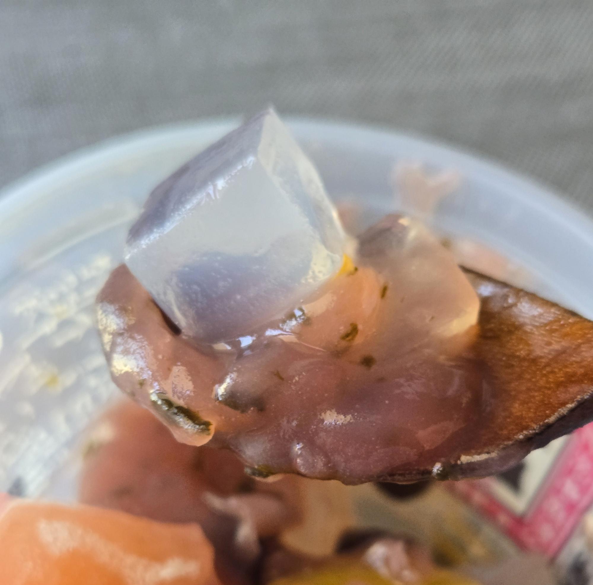 あんみつを買うと、蜜は「黒みつ」「赤みつ」「抹茶みつ」「ほうじ茶みつ」の4種類から選ぶことができる。個人的には、寒天の素材の味が活きる「赤みつ」がお気に入り。