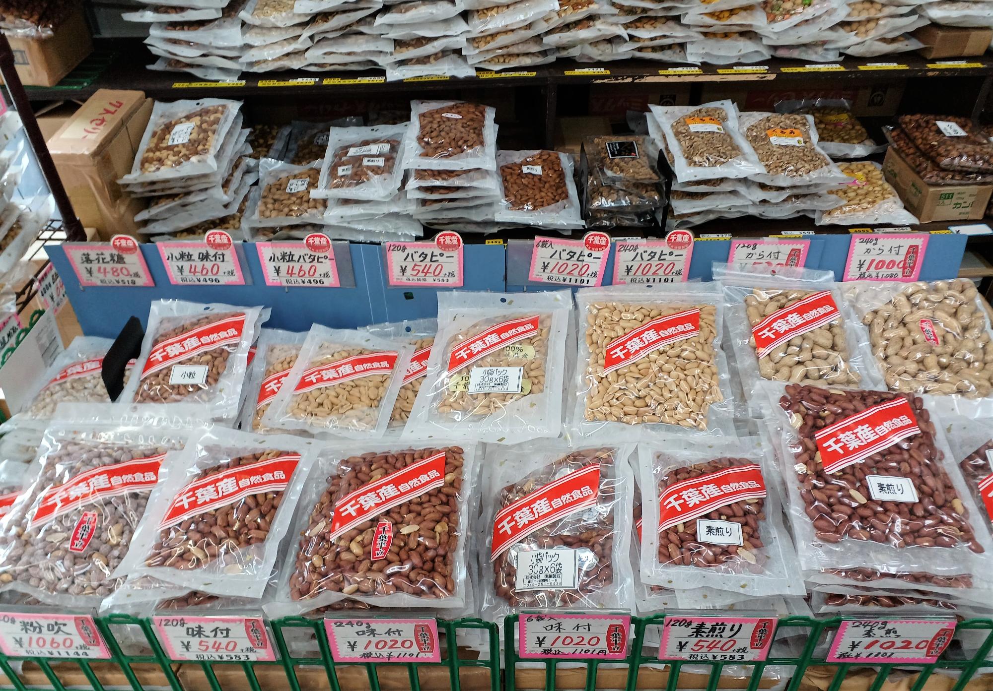 中でも落花生の扱いが多く、「素煎り」から「バタピー」、「粉吹」、「から付」まで。