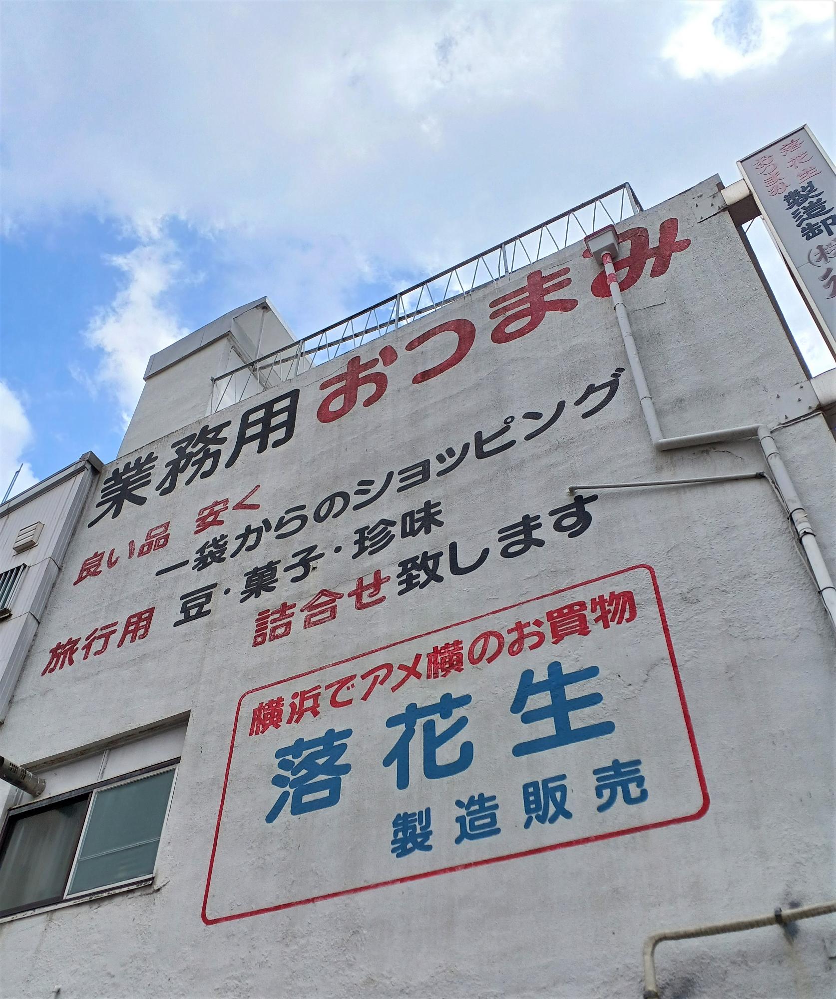 伊勢佐木町通り側の壁には、印象的なコピーライティングが。「良い品 安く 一袋からのショッピング/旅行用 豆・菓子・珍味 詰合せ致します」。昭和時代を感じさせる表現に、温かみを覚える。「横浜でアメ横のお買物」というキャッチコピーも、言い得て妙。