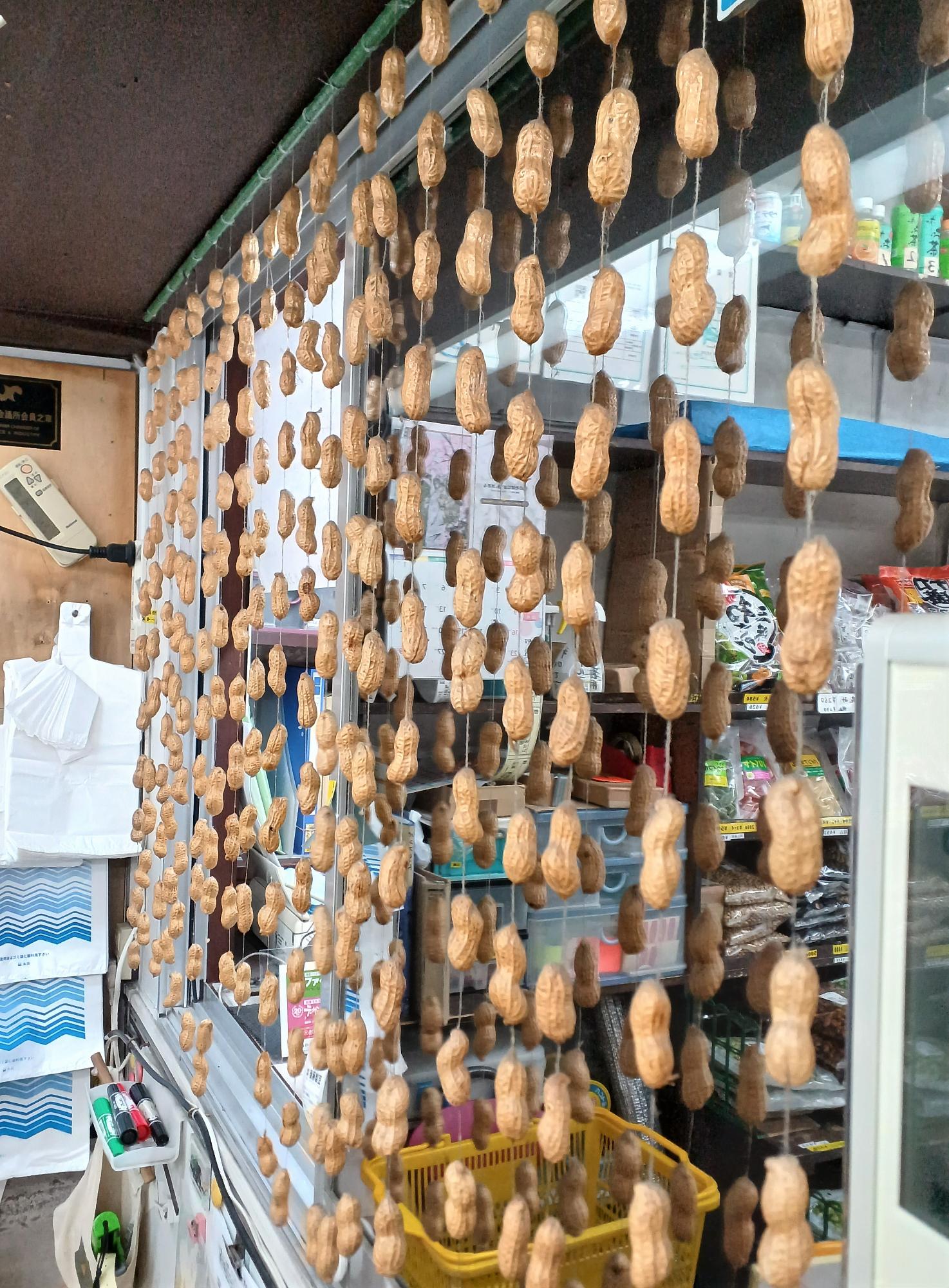 レジ横の落花生のすだれは、殻の上下に穴をあけて糸を通したもの。何かと手間を省きがちな令和の日常だが、こんな手作り感も大切にしたいと思わせてくれた。