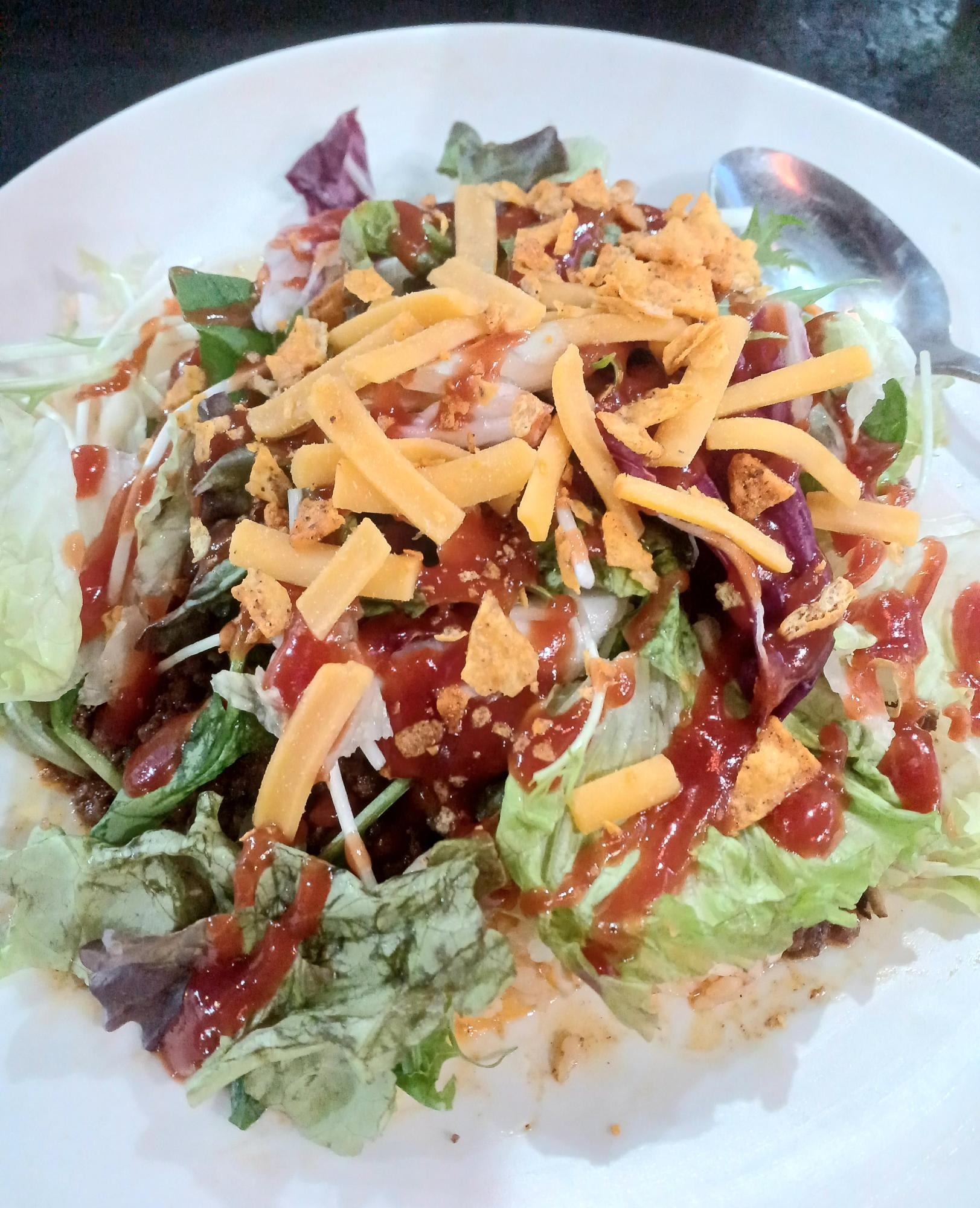 定番の炭水化物から、「タコライス」、「沖縄そば」。このタコライス、チーズ天国です。見えている部分だけチーズがあるのではなく、ご飯の中にもたっぷり仕込まれています。飲んだあとの締めに、そしてカロリー大好きなみなさんには、たまりません。