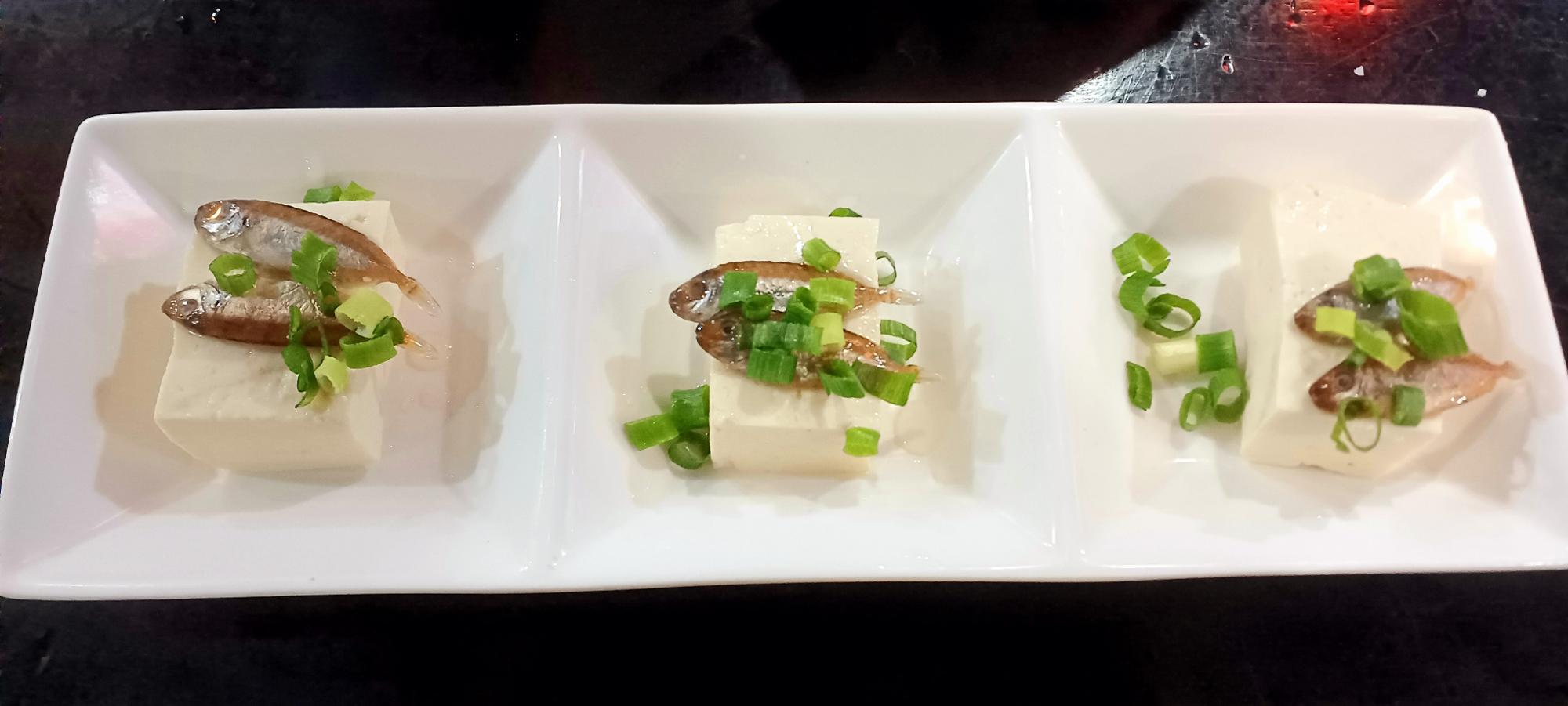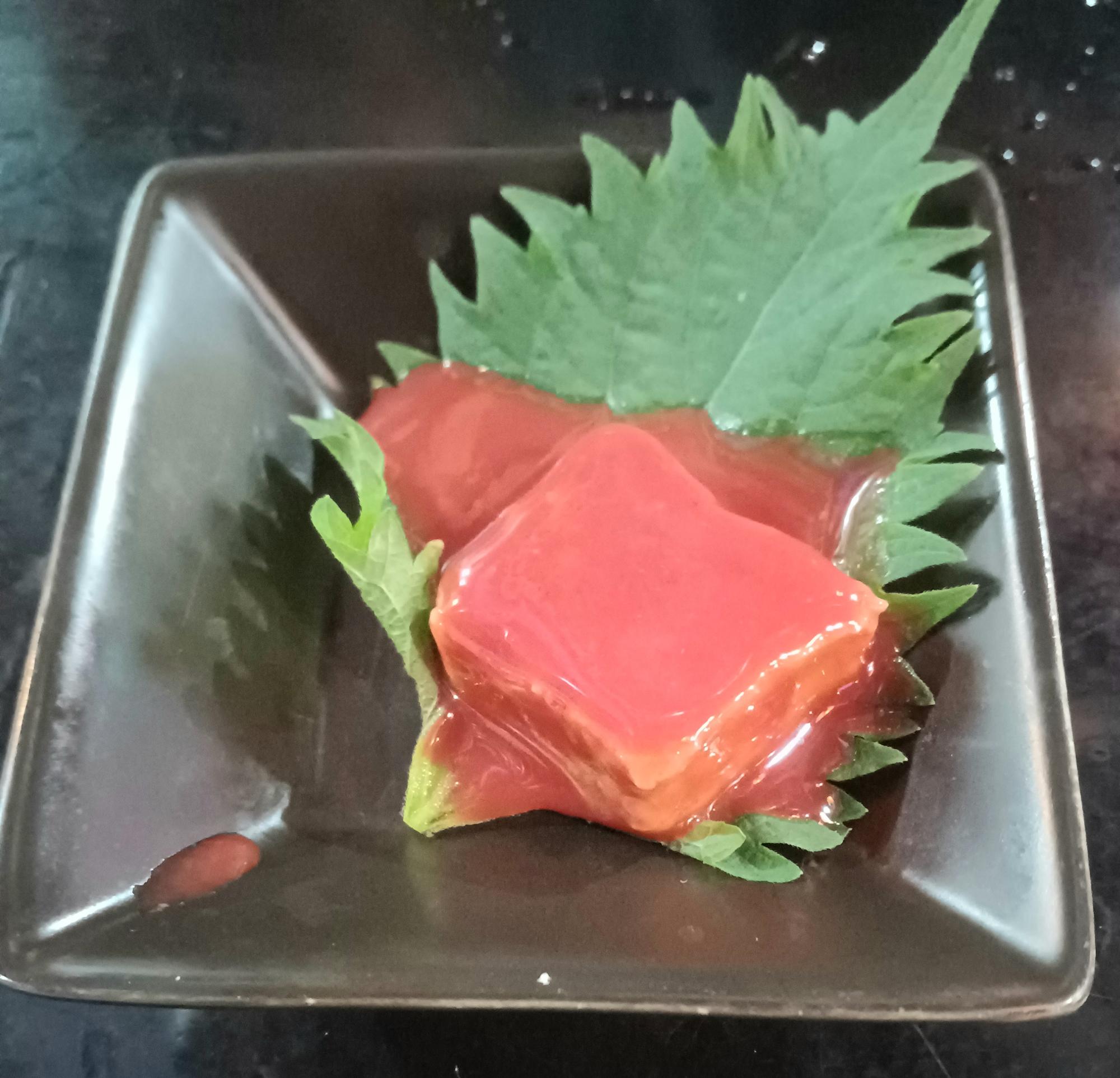 お酒のお供に、「豆腐よう」と「すくガラス」。「豆腐よう」は泡盛や麹を使った沖縄珍味。”奈良漬けの神髄”のような味がします。豆腐ようをお伴に泡盛や焼酎をちびちびと。写真のとおり、色味はショッキングピンク(紅麹)。