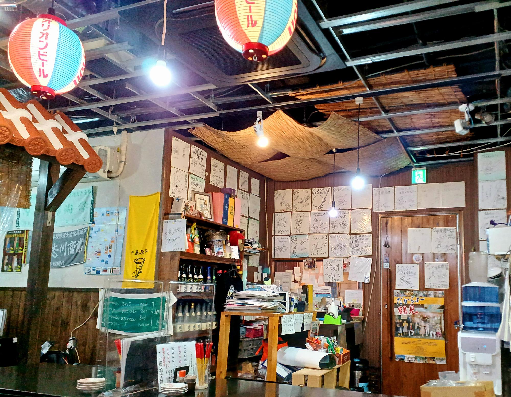 オリオンビールの提灯も楽しい店内。テーブル席、座敷席(掘りごたつ式)、カウンター席とあり、一人でも大勢でも利用しやすいお店です。大型のモニターで沖縄の映像も流れていて、一歩入ったところから沖縄の雰囲気に!