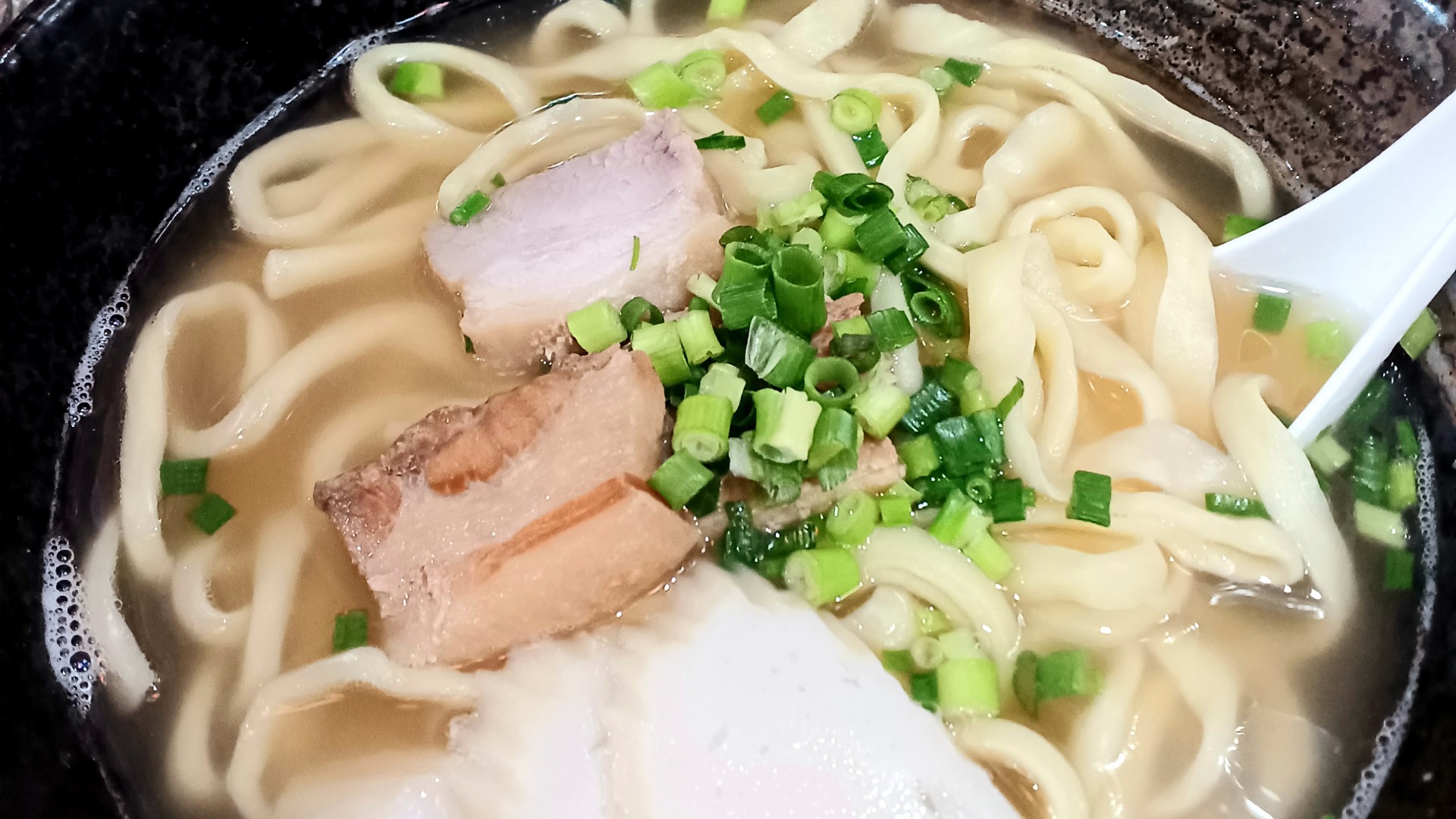 沖縄そばは、平打ち麺のような、すこし幅の広い麺。トッピングは豚の三枚肉、スープは出汁の旨味を楽しみます。お好みで「こーれぐーす」(島とうがらしを泡盛に漬け込んだ調味料)や紅ショウガを入れながら。夕ご飯としての利用なら、これ一杯をいただくだけでも十分に沖縄気分です。