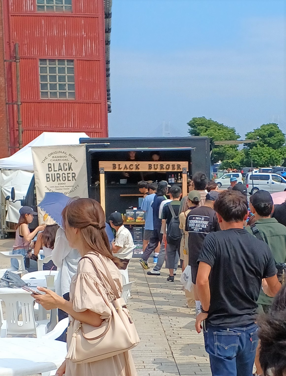 初日の土曜日、ハンバーガー店には十人以上の列も珍しくなかった。人は多いが、赤レンガ倉庫の開放感が生かされた形で、息苦しいほどの混雑には感じなかった。キッチンカーなど、各店舗によってブースの形はユニークだ。