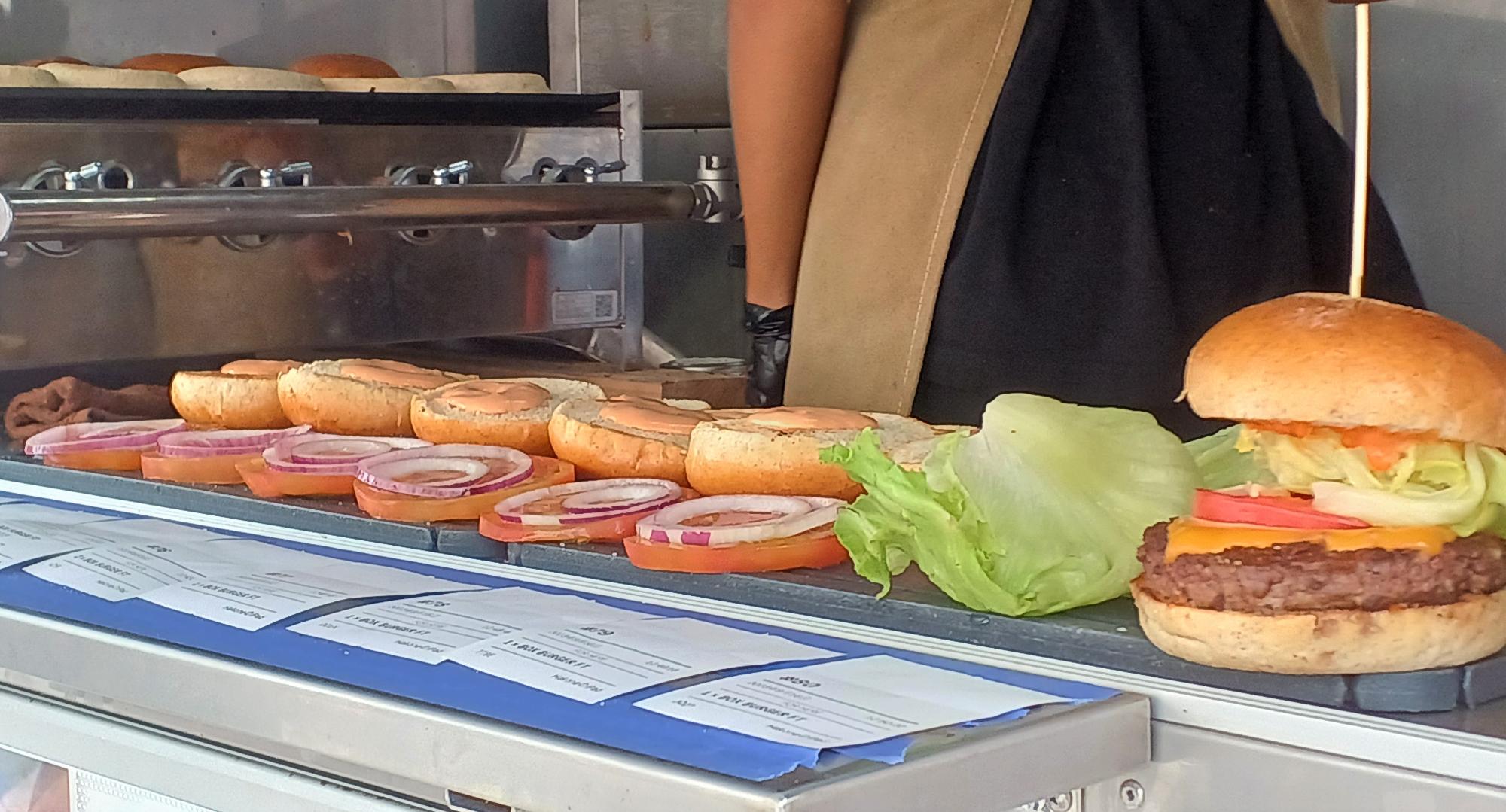 飲食ブースは、ハンバーガーを中心にサンドイッチやホットドッグ、フライドポテトなどの軽食がそろう。