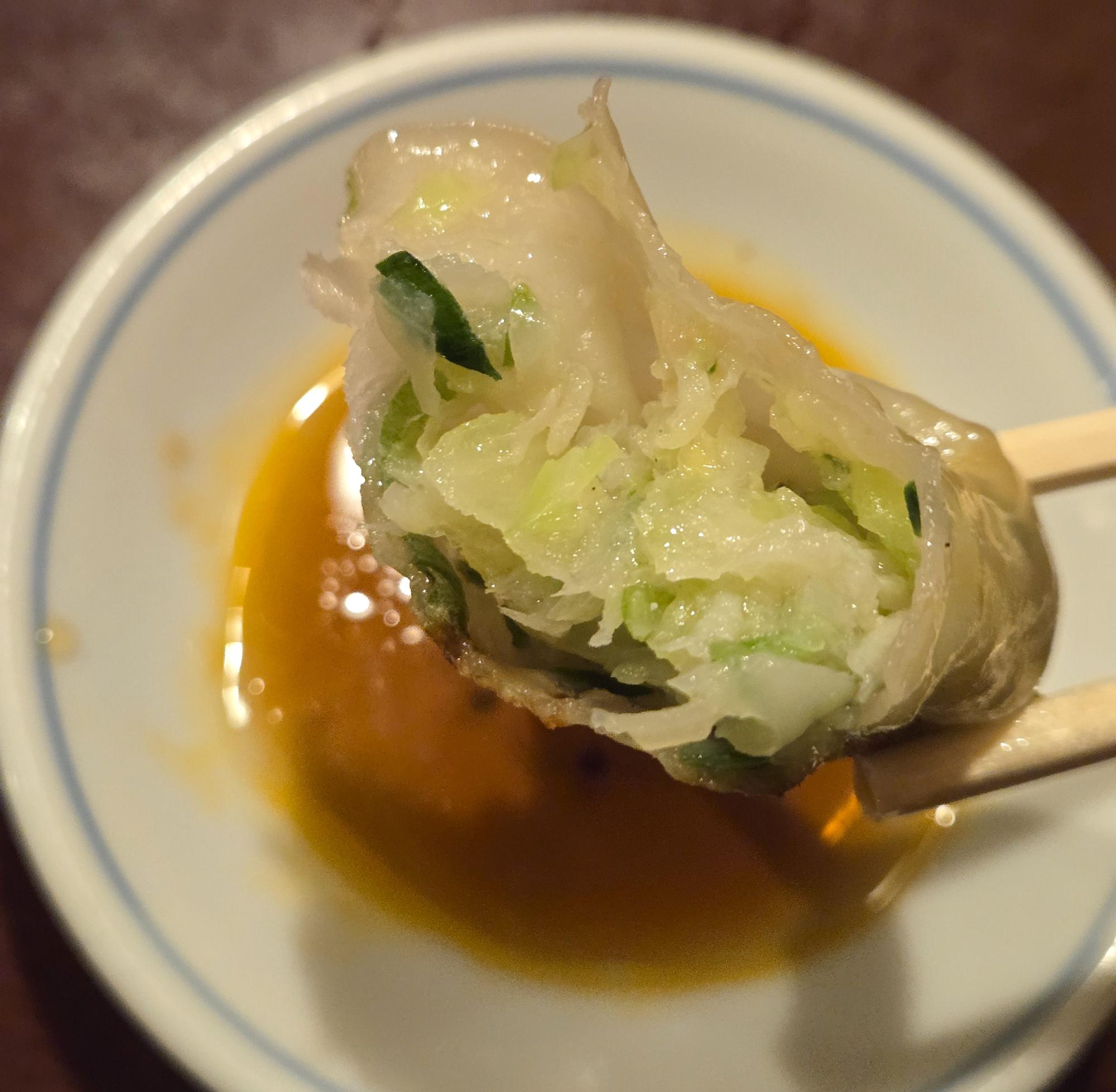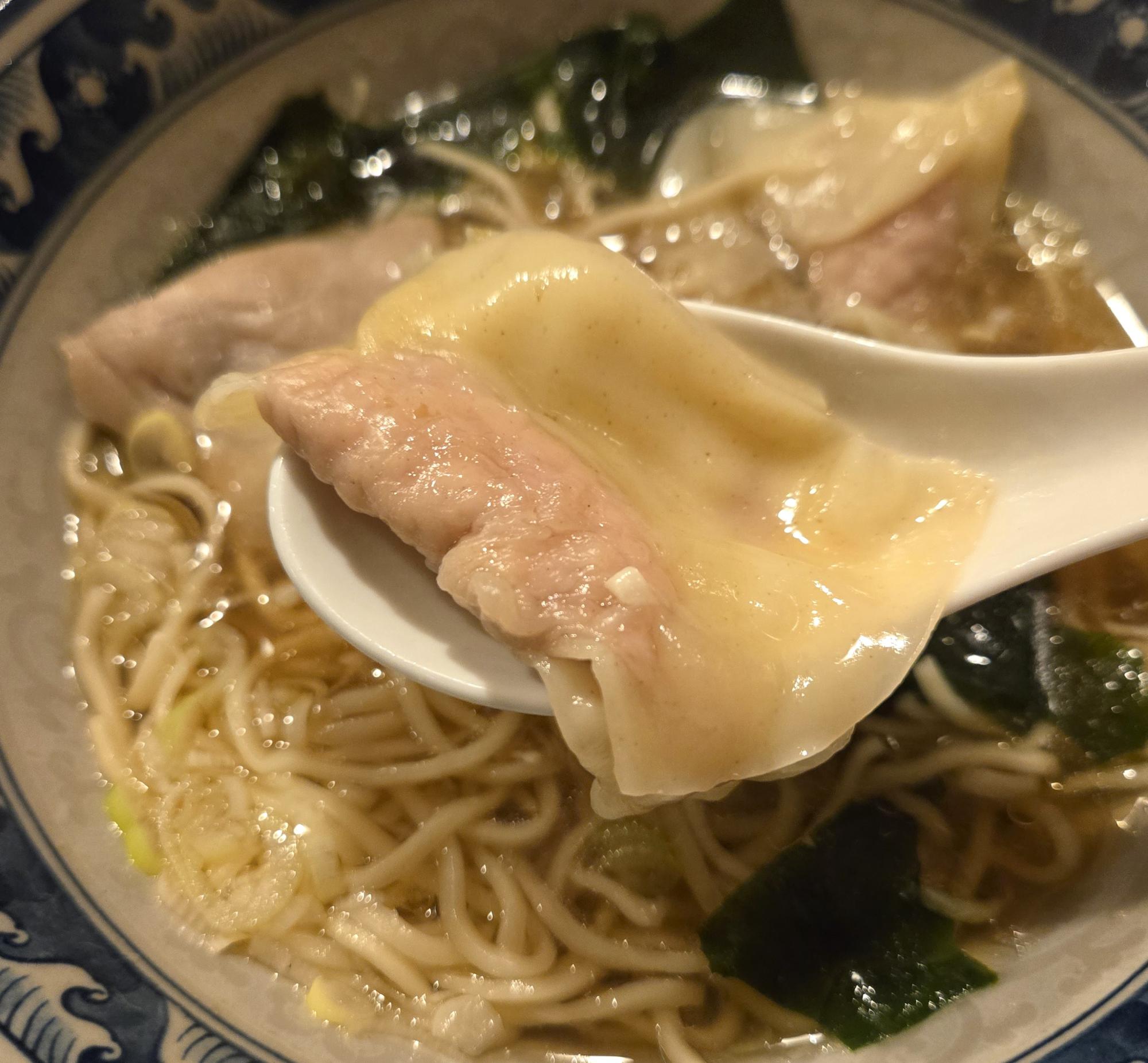 ワンタンの餡が面白く、長方形のような形。奥に甘い香りを感じる、特徴ある味わいだ。