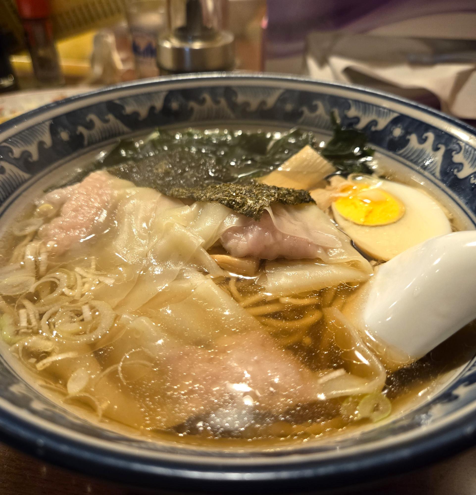 ワンタンメン。シンプルなラーメンに、ワンタン、卵、メンマ、海苔が入っている。