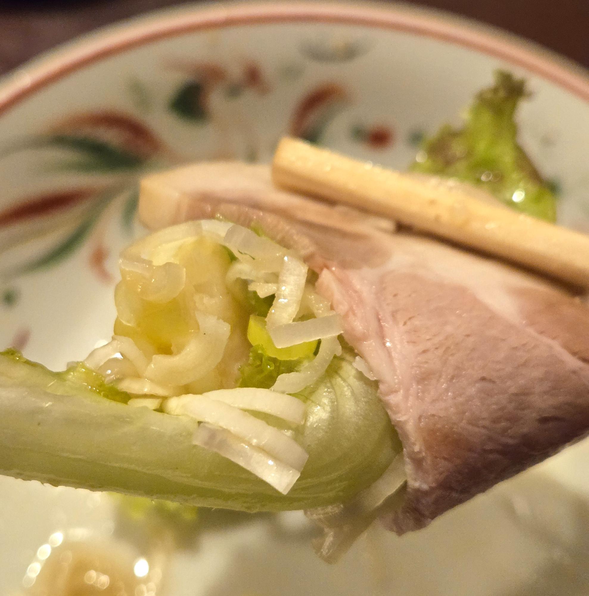 チャーシューは甘めのタレとともに。こんもりと盛られたネギとレタスと一緒にいただく。