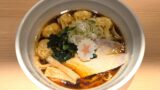 ワンタンメン。シンプルなラーメンに、ワンタン、卵、メンマ、海苔が入っている。