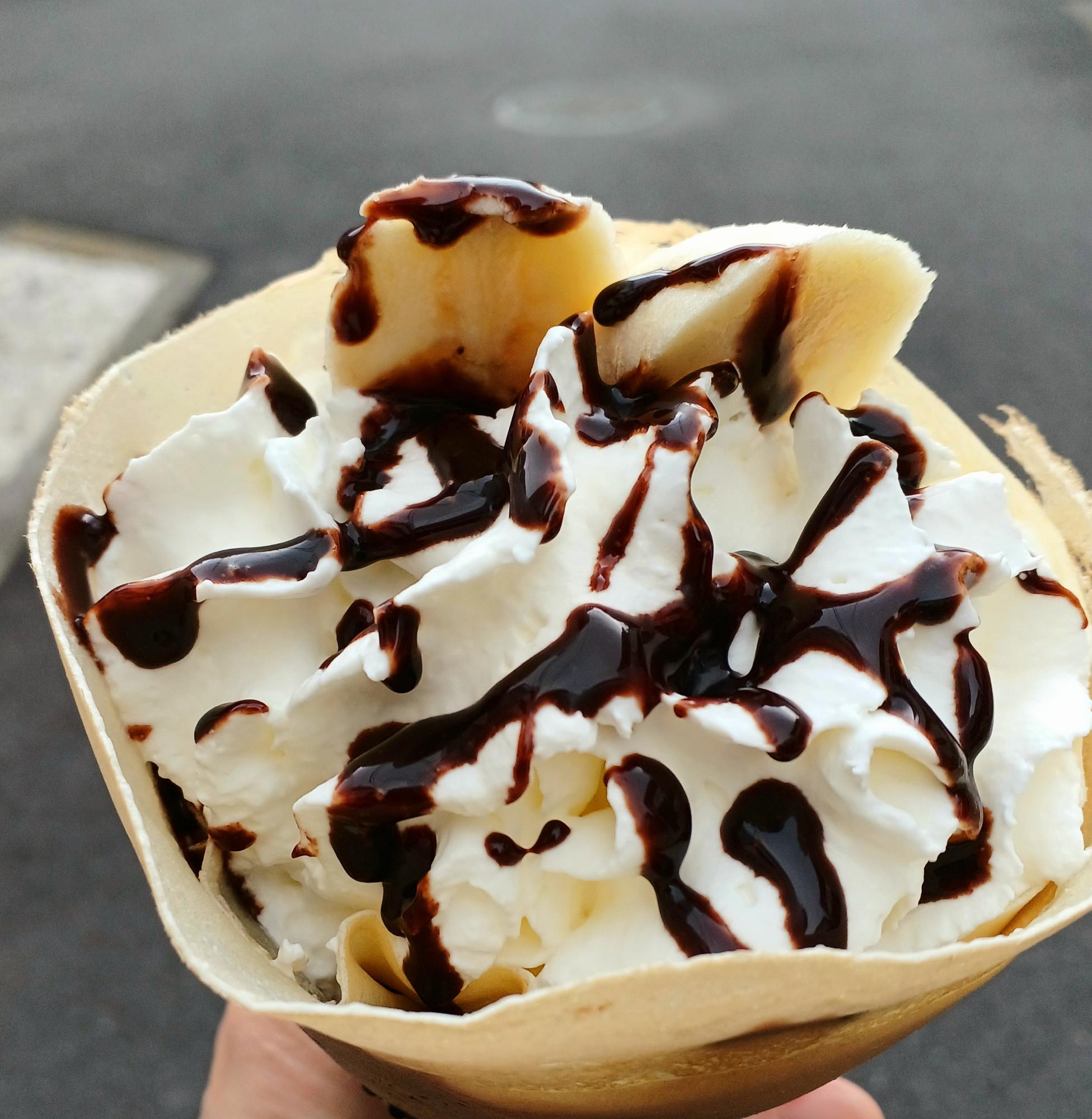 「生クリームの消費期限10分!」とメニュー表には書いてある。持ち歩くときは、アイスとクリームを溶かさないように注意。そういう意味では、冬にもおすすめ。