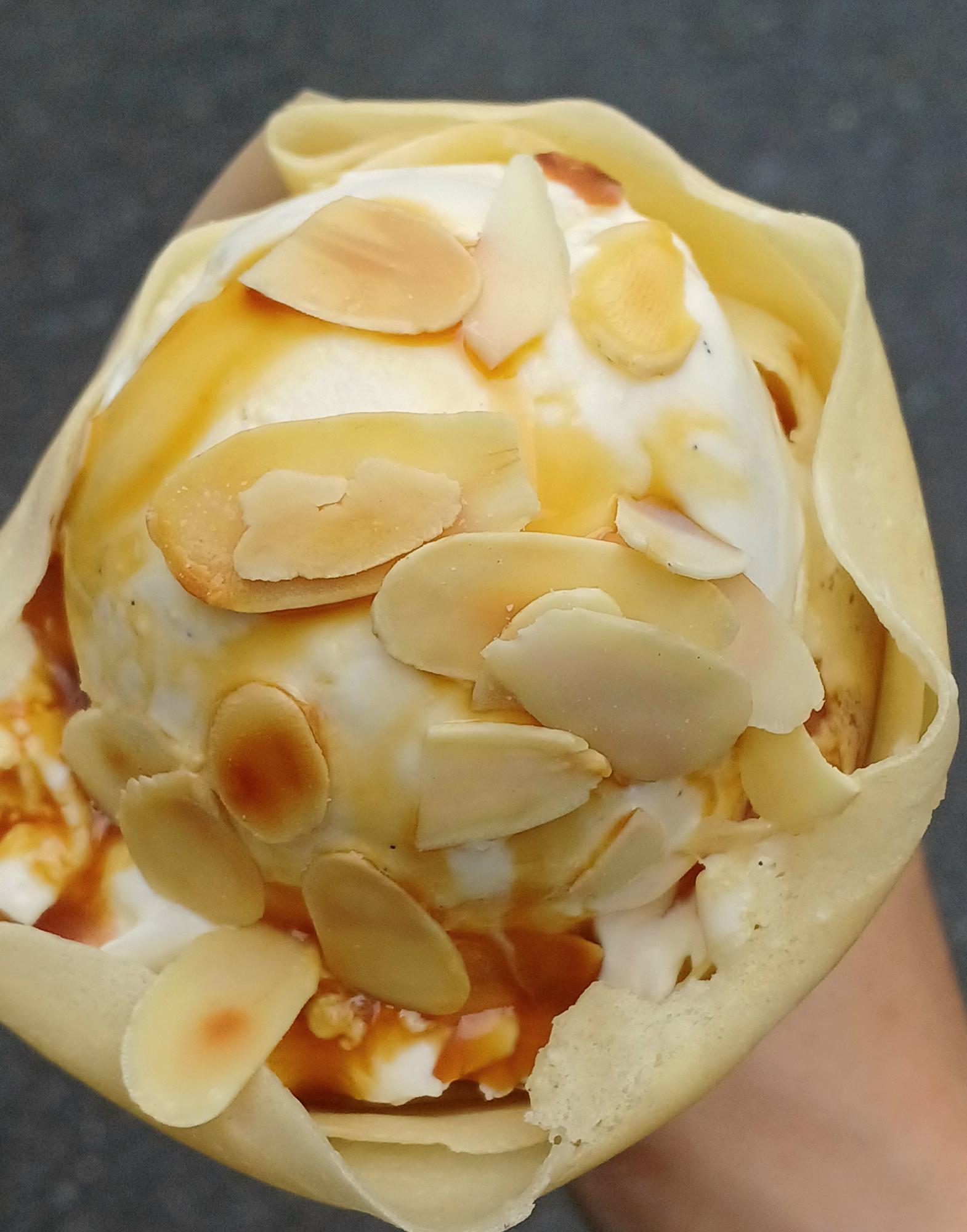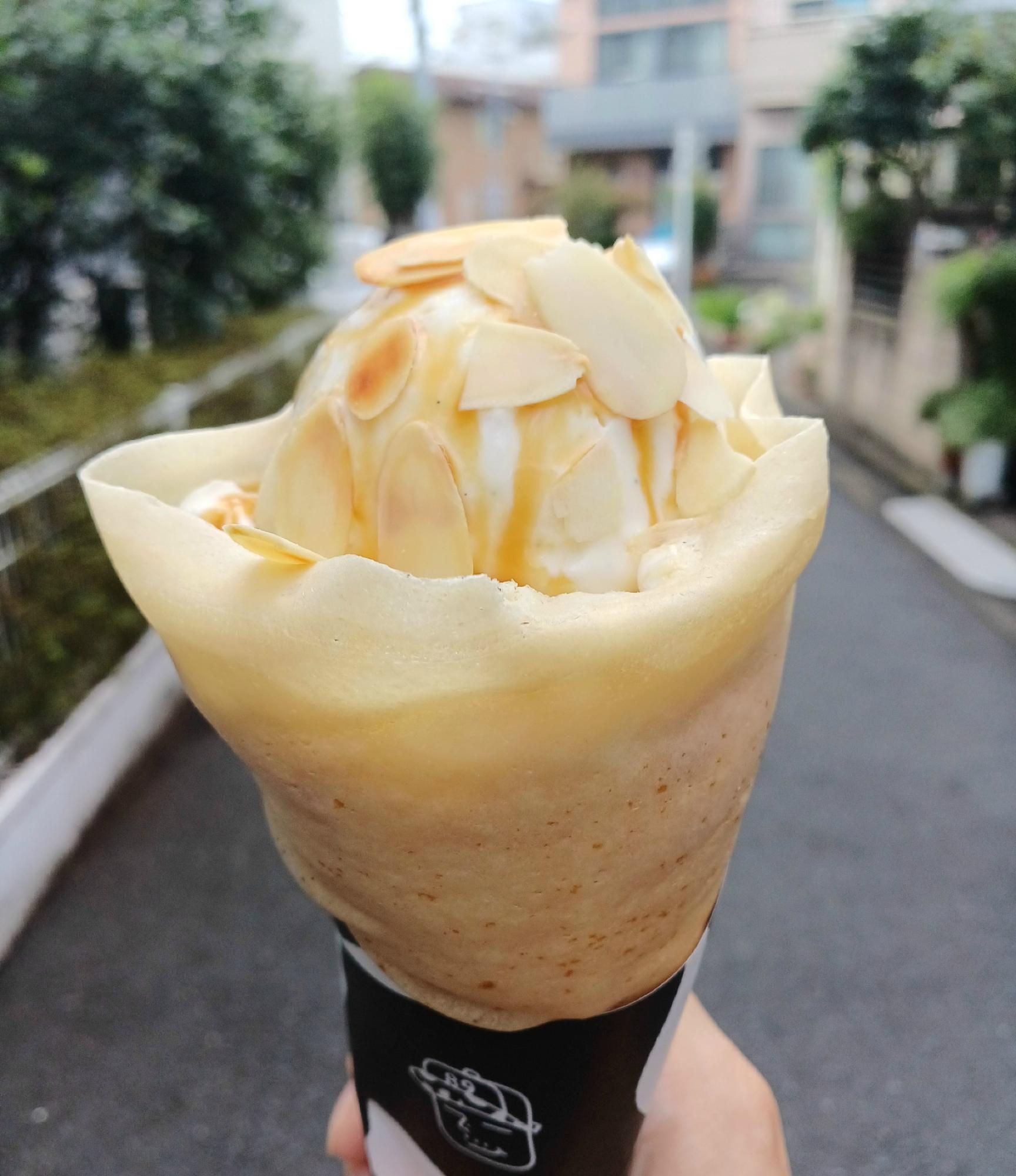 「キャラメルアーモンド生クリーム」にアイスをトッピング。バニラビーンズの黒粒がよく見える。こちらも牛乳をしっかりと味わえるメニューで、濃厚でありながら甘すぎず重すぎない。
