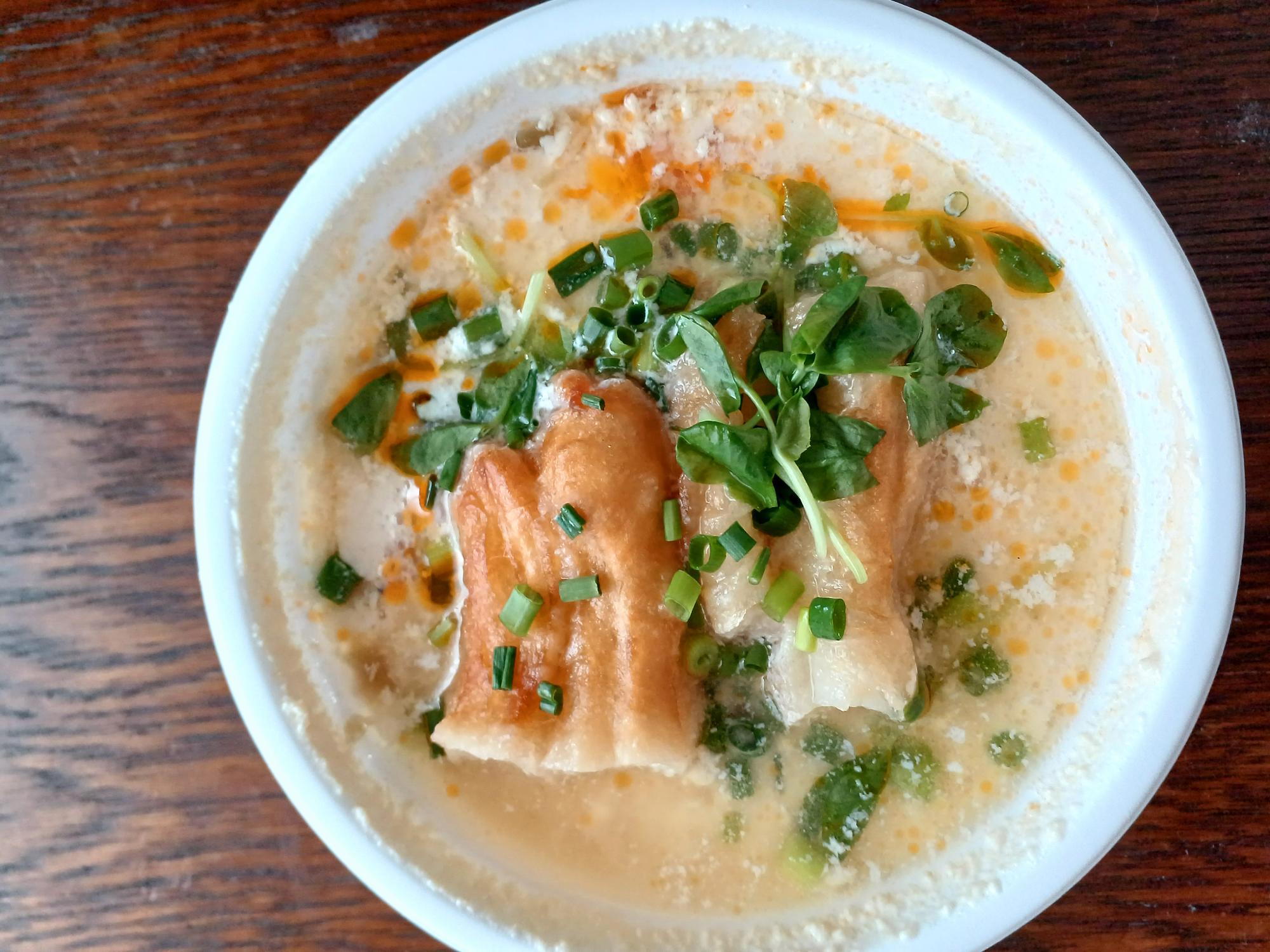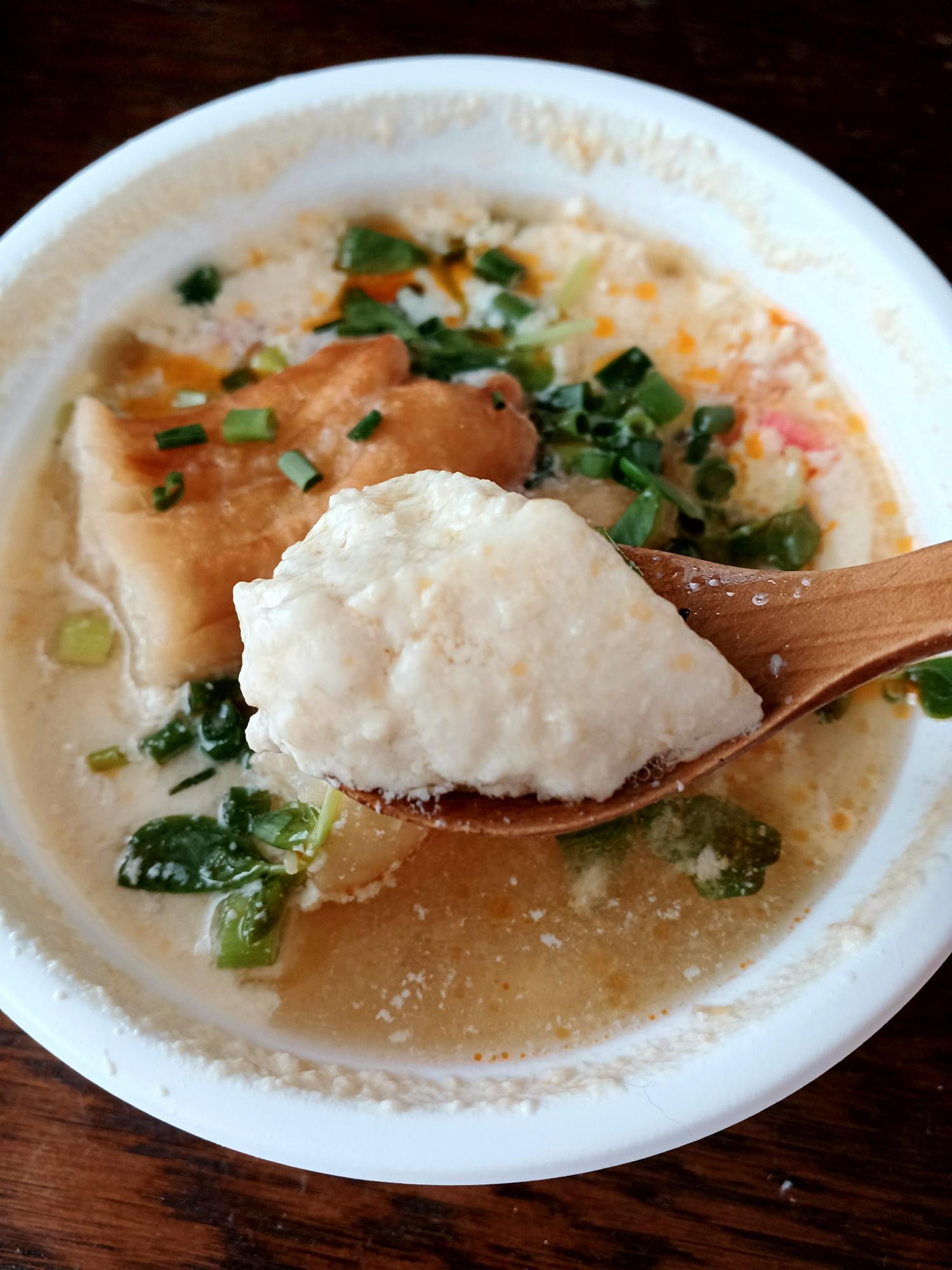 台湾朝ごはんの定番、「鹹豆漿(シェントウジャン)」をテイクアウトでいただきます。酢の酸味やラー油で味わう、豆乳・豆腐のスープです。スープに浸した揚げパンがコクを出しています。