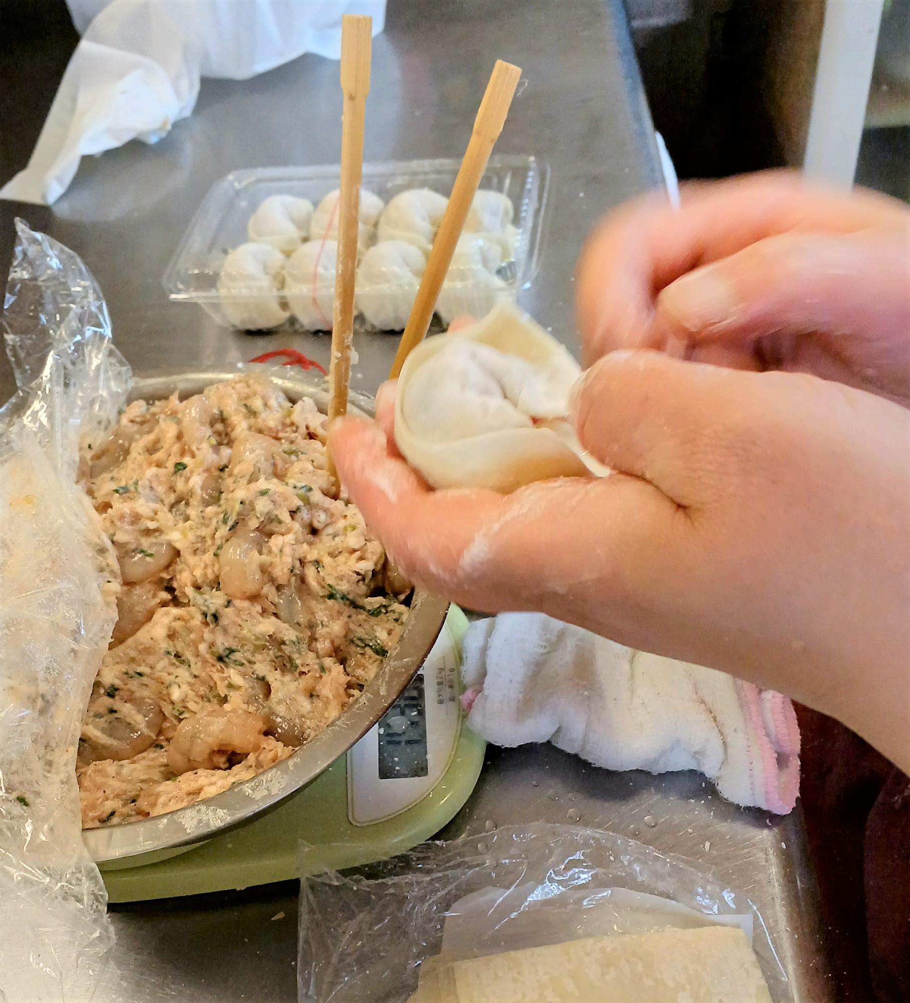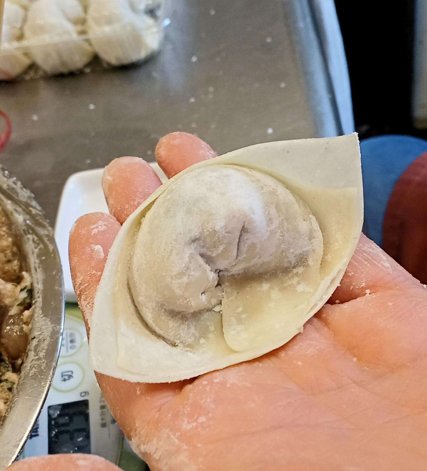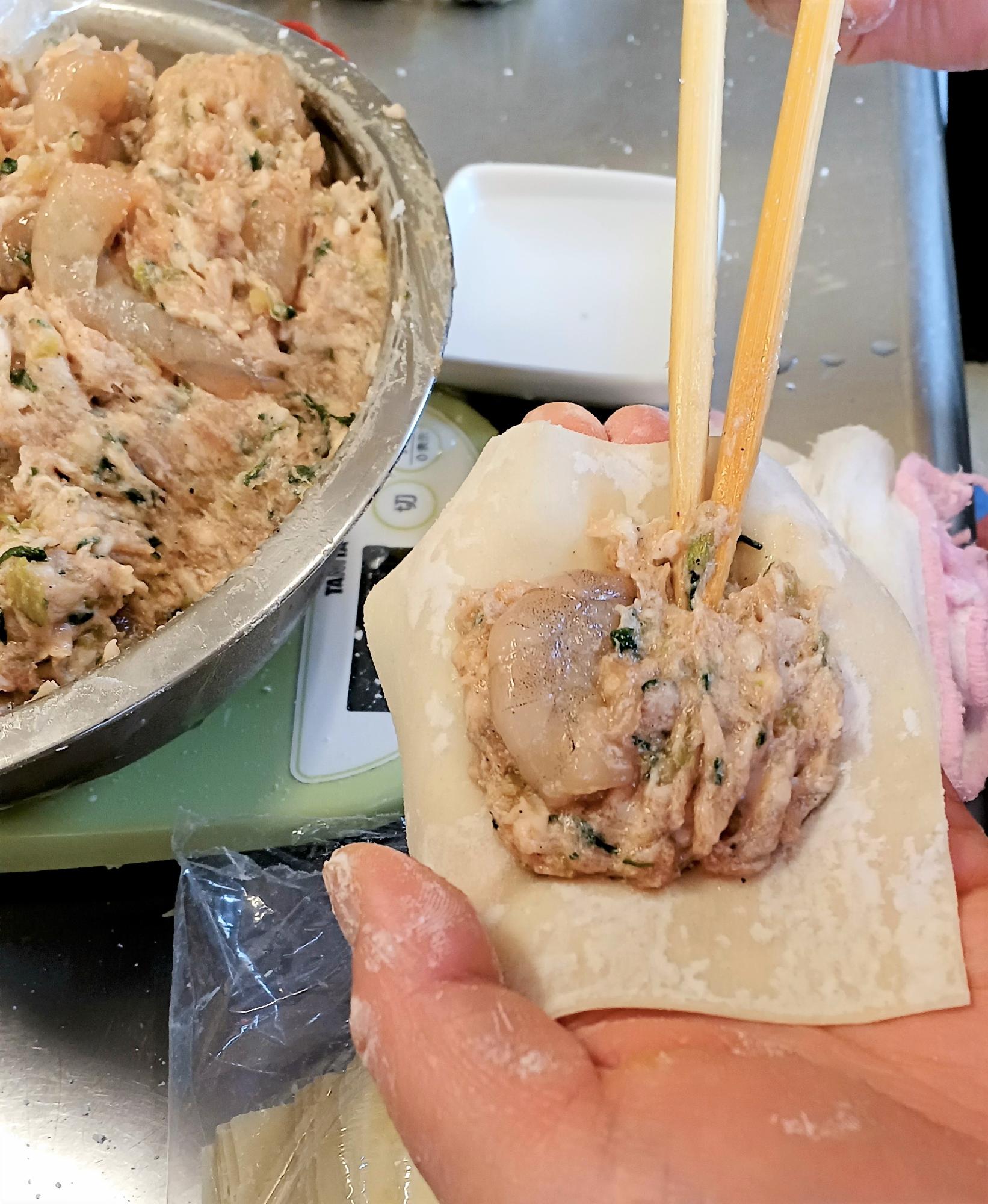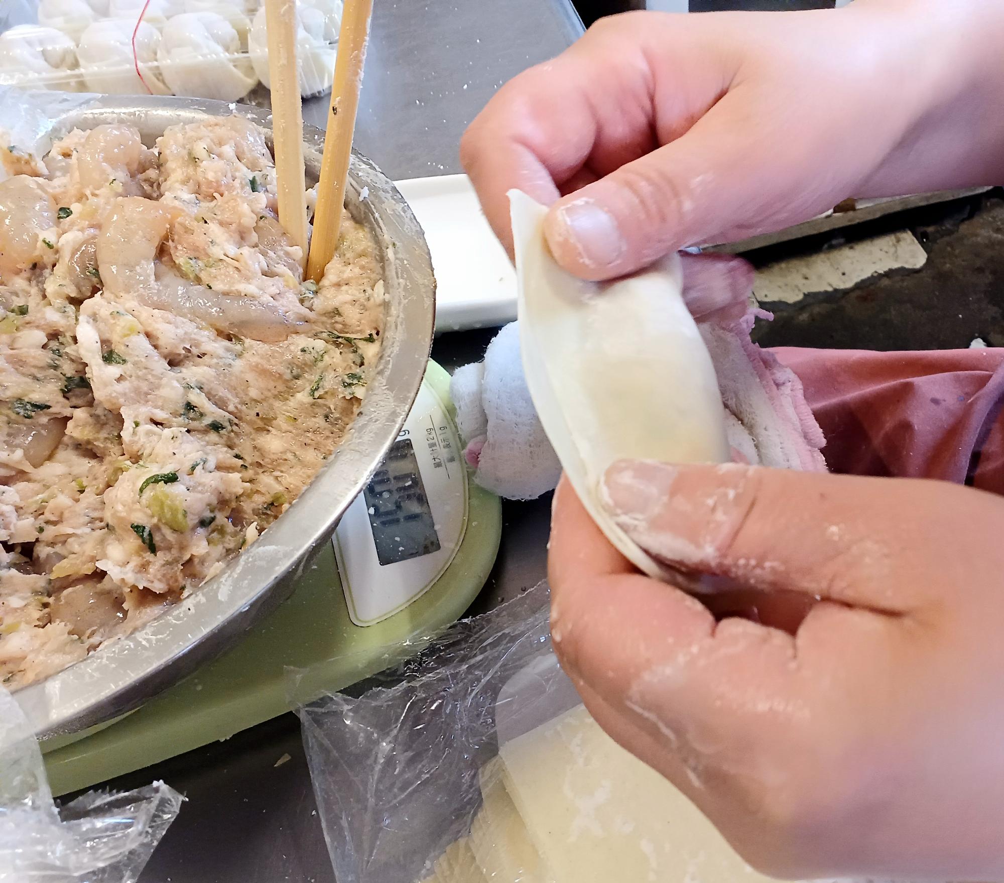 この「餛飩(ホゥントゥン)」、包み方を見せてもらいました!写真はえびワンタン。まず、四角い皮にえび入りの餡が乗せられます。