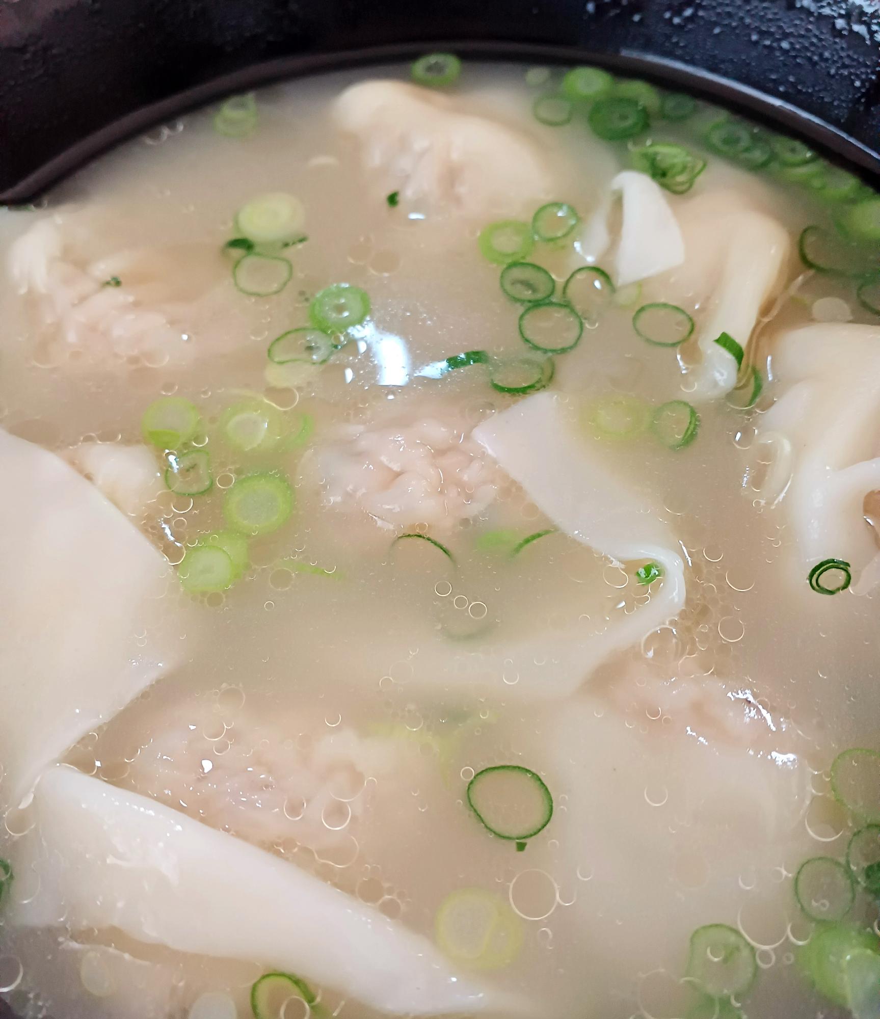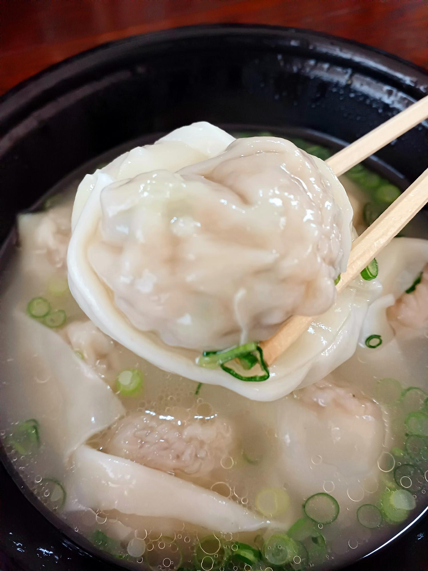 一つあたり、赤ちゃんの握りこぶし程度の大きさ!これが上海でいう「大餛飩」(大ワンタン)だそうです。白濁した濃厚スープととともにいただきます。上海人の気分になって、8個入りのテイクアウトをペロリ!