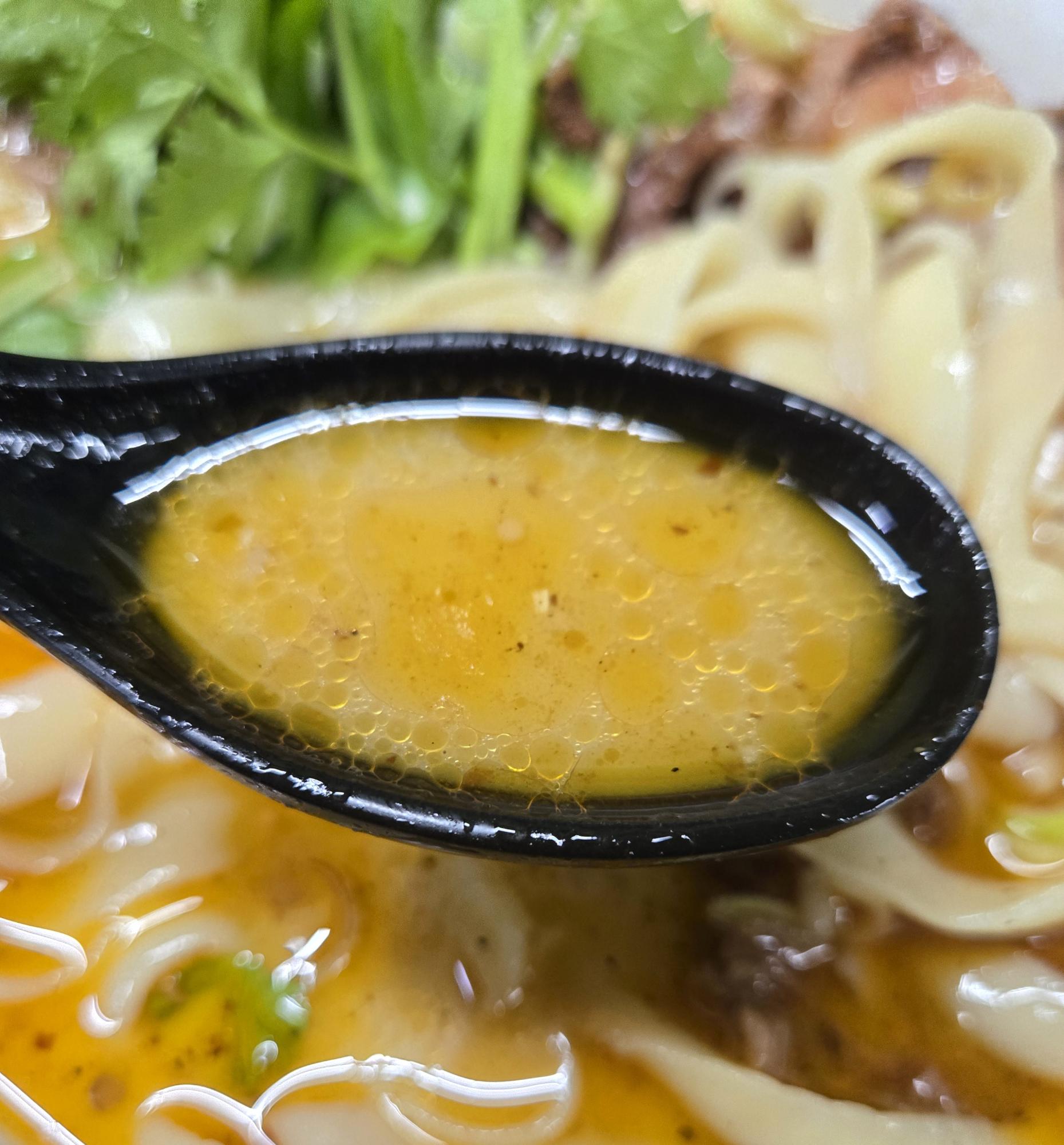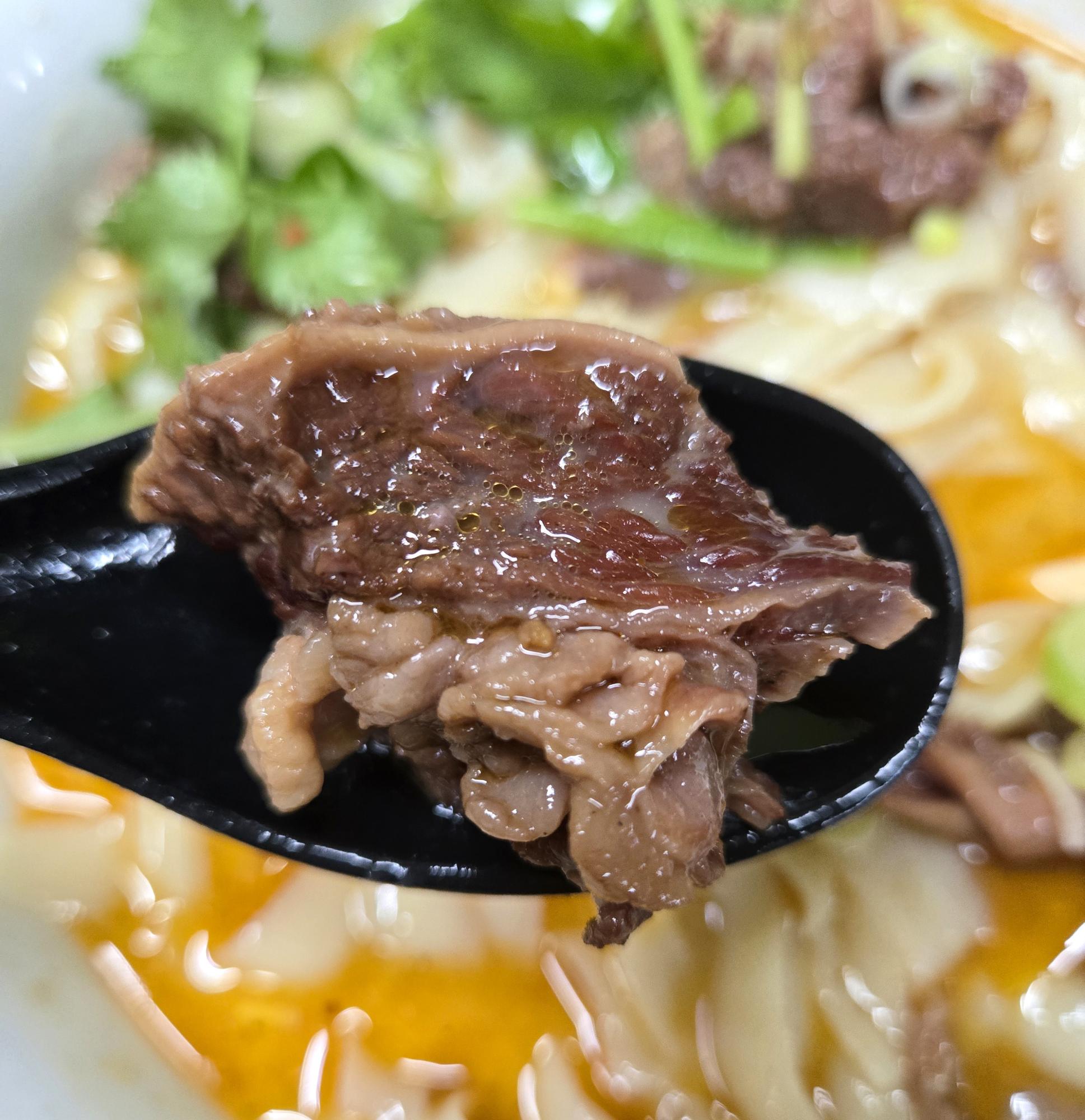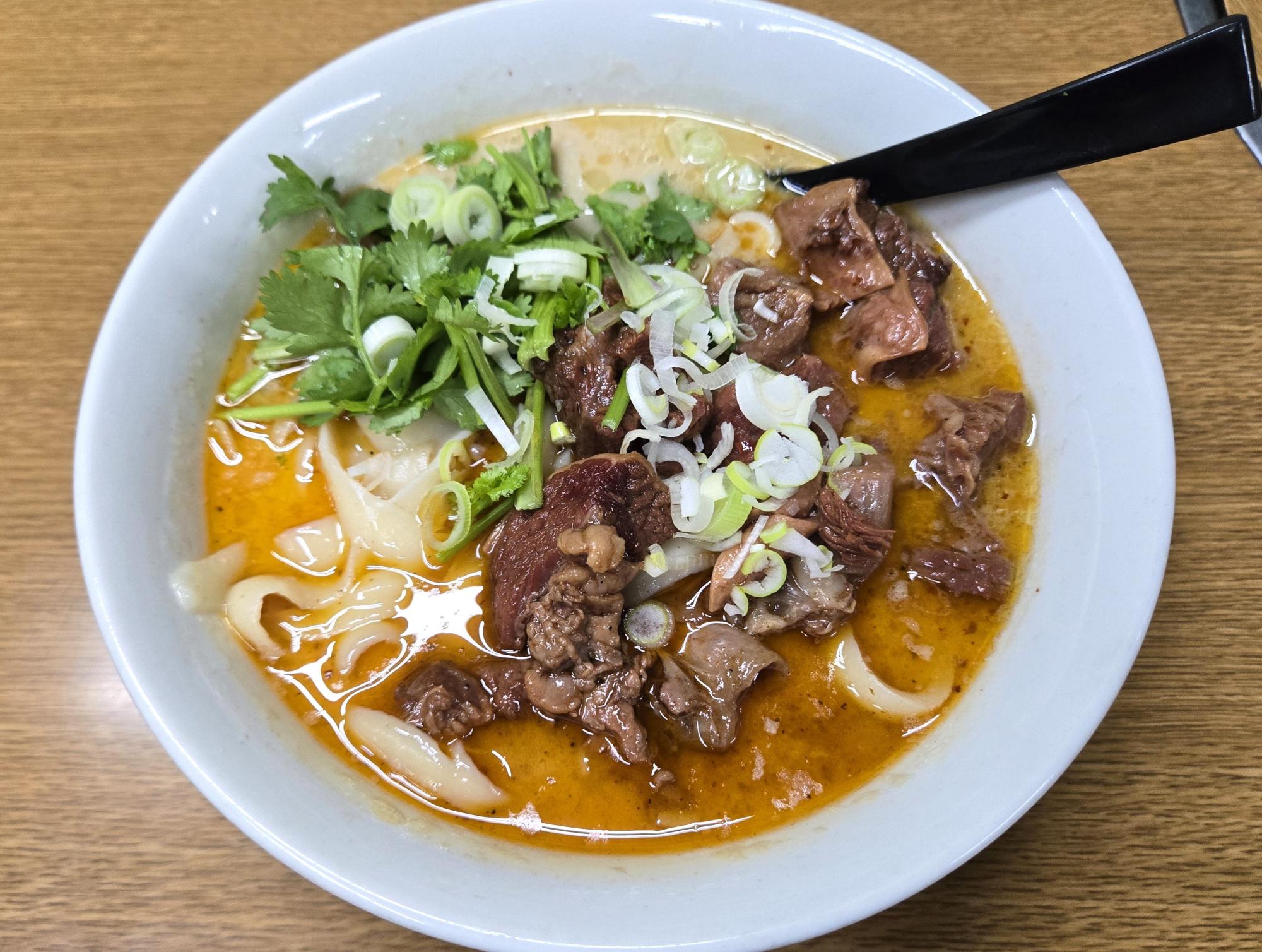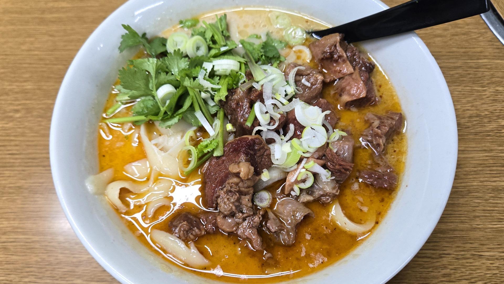 牛肉もごろごろと入っていて満足。麺の量も、一般的な中華麺やラーメンより圧倒的に多い。軽めのランチなら、半分の量でも足りそうなくらいだ。