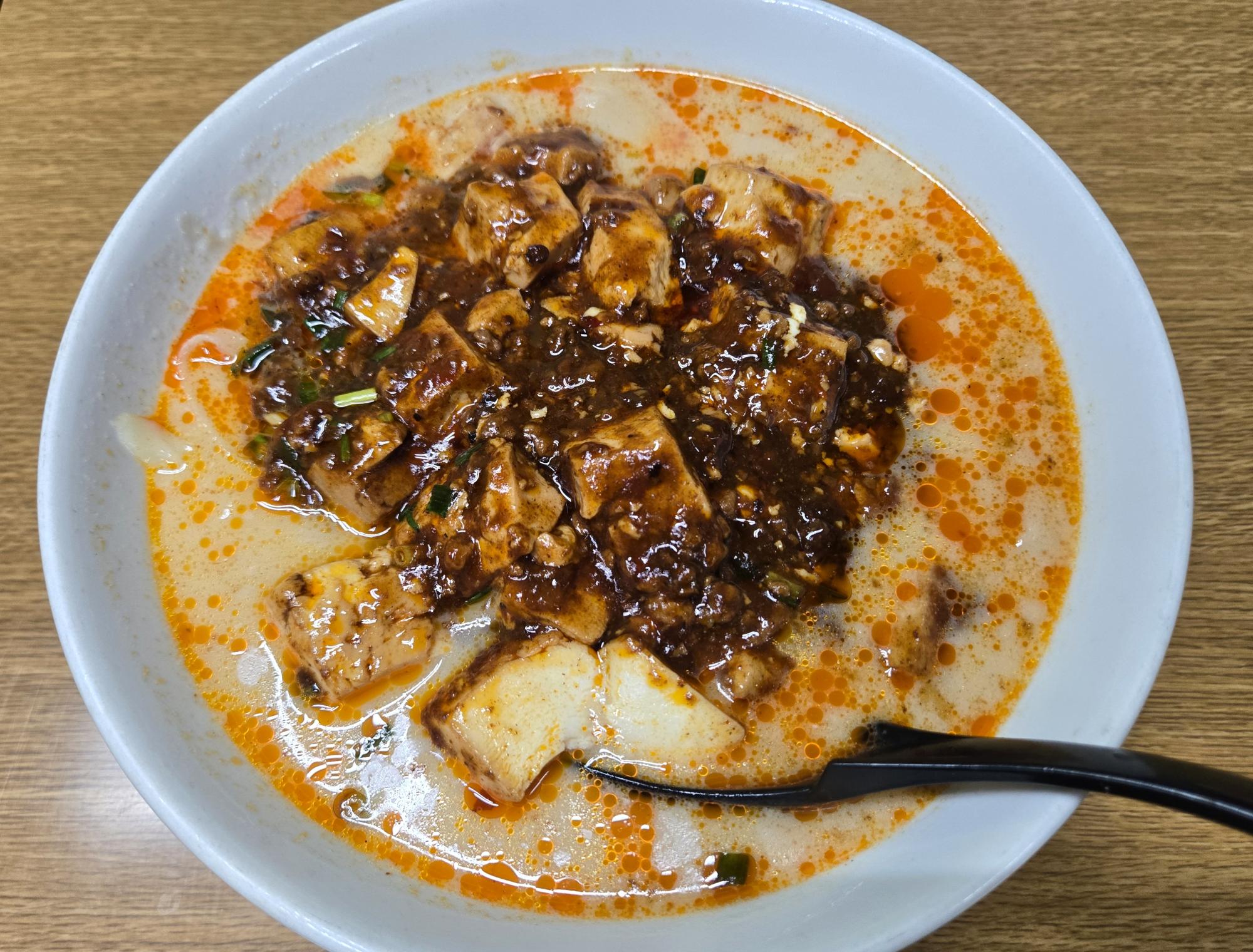 こちらは「麻婆刀削麺」。名前のとおり、麺の上にドカンと麻婆豆腐が乗っている!汁ありと汁なしが選べるが、写真は汁あり。