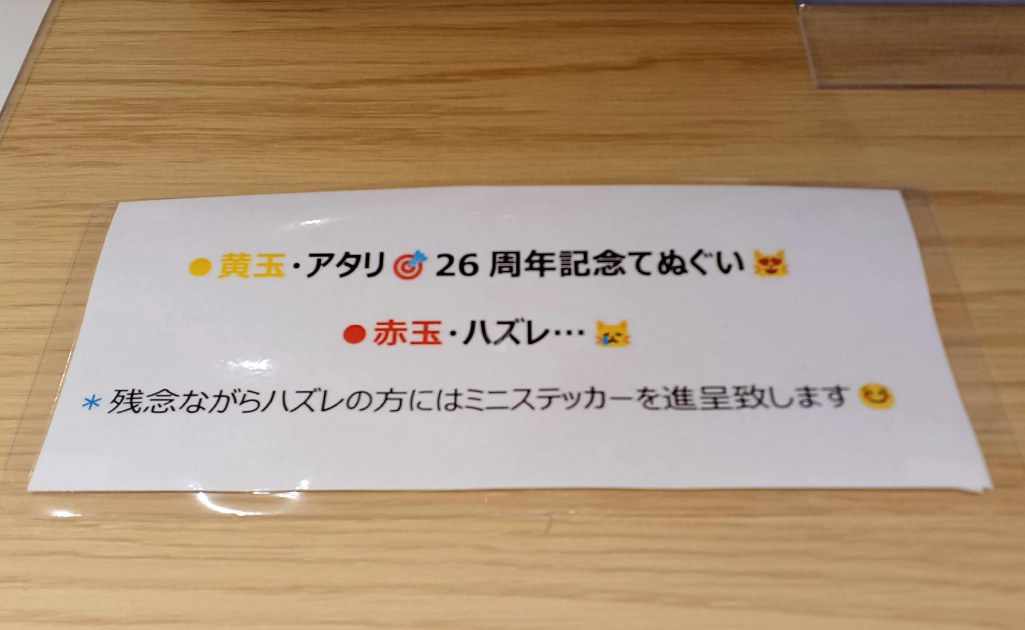 うっ、二度目もハズレとは…。なんとなく、二度やれば当たるのではという甘い考えを持っていた。抽選に外れたので、再びミニステッカーをもらう(ミニステッカーについては前回の記事をご参照ください)。