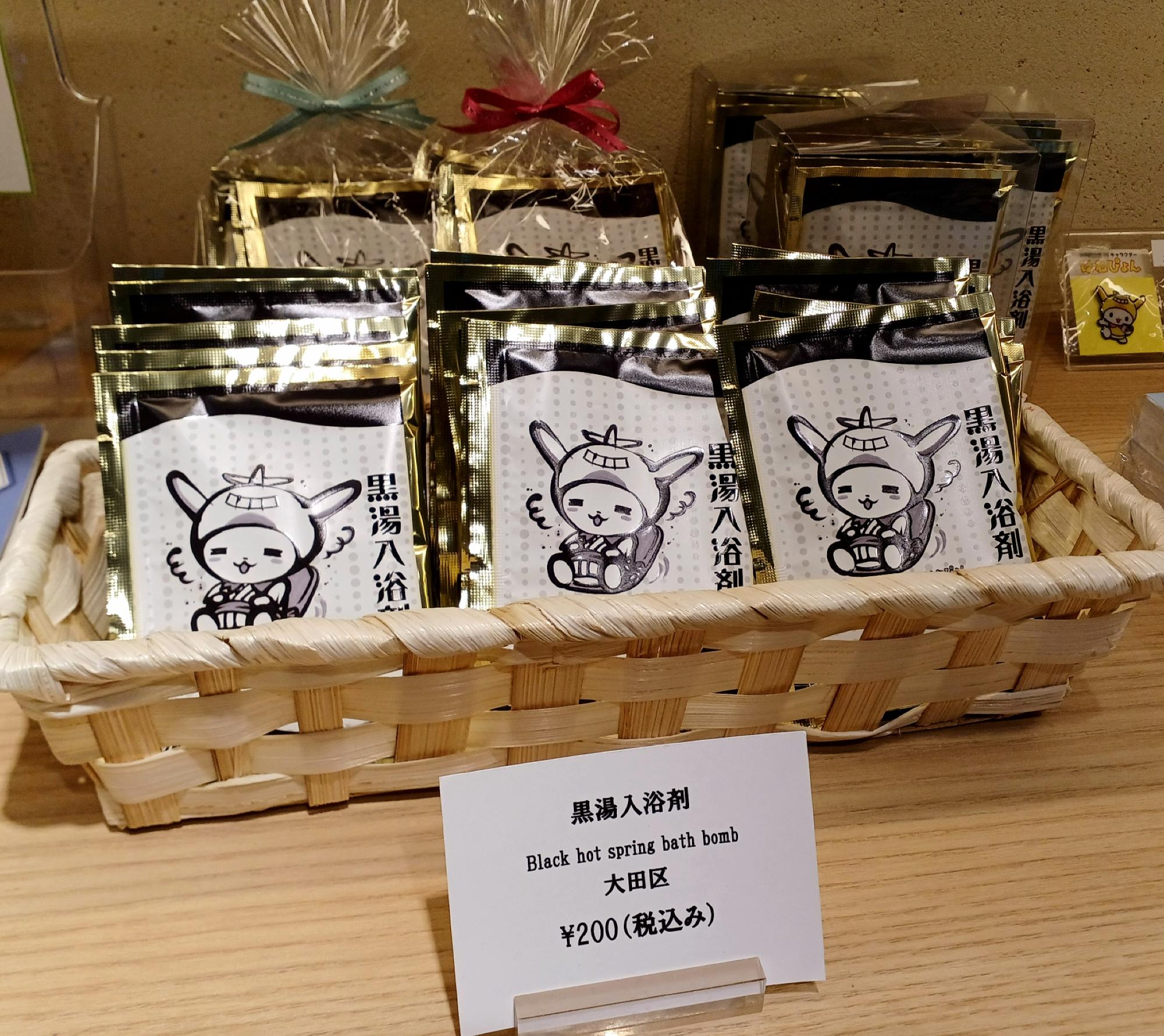 この観光情報センター、ちょっとした手土産購入にも便利。写真は「黒湯入浴剤」。大田区ゆかりの日本酒・クラフトビール、菓子なども扱っている。