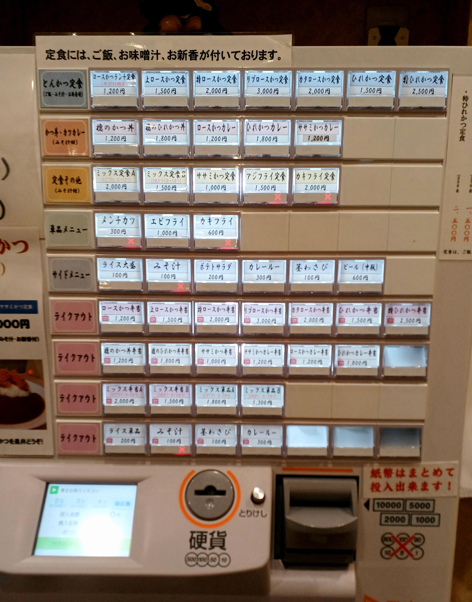 まず食券を購入。一口にとんかつといっても、種類がいくつかあり決断力を試されます。素直に左上の「ロースかつ定食」にするのか、「上ロース」や「特ロース」にレベルアップするのか…。