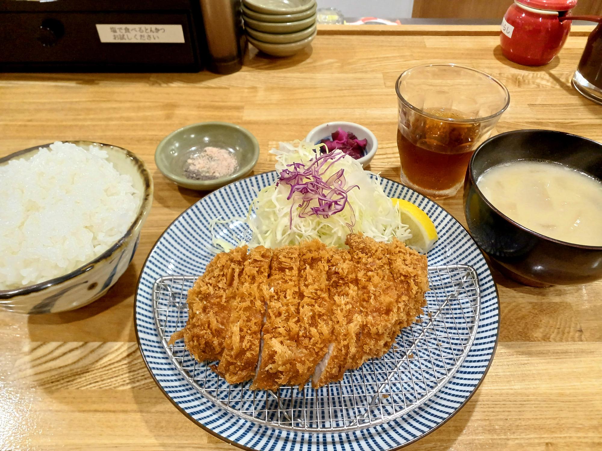 筆者はロースかつランチ定食を。厨房で次々に揚げられていく、とんかつたち。定食にはご飯、味噌汁、お新香が付きます。こちらが全体像。