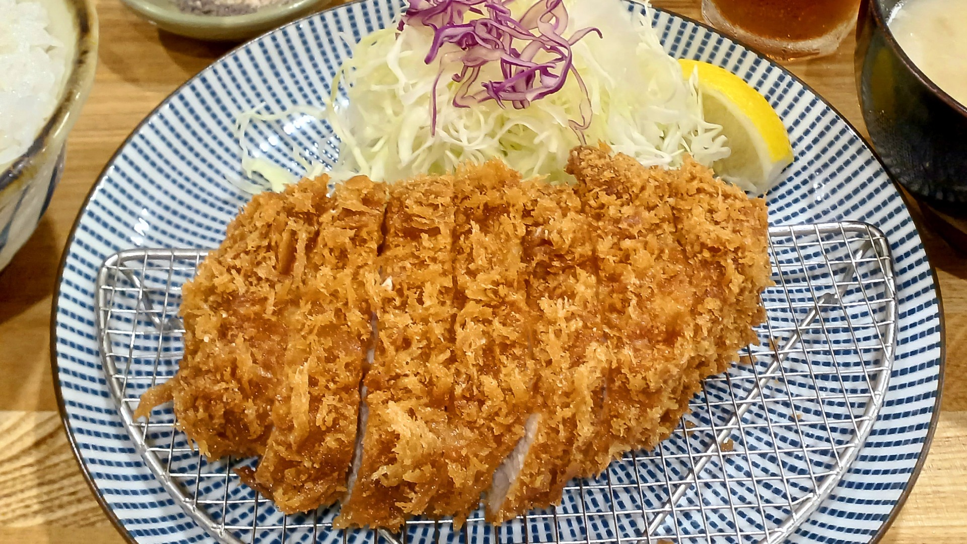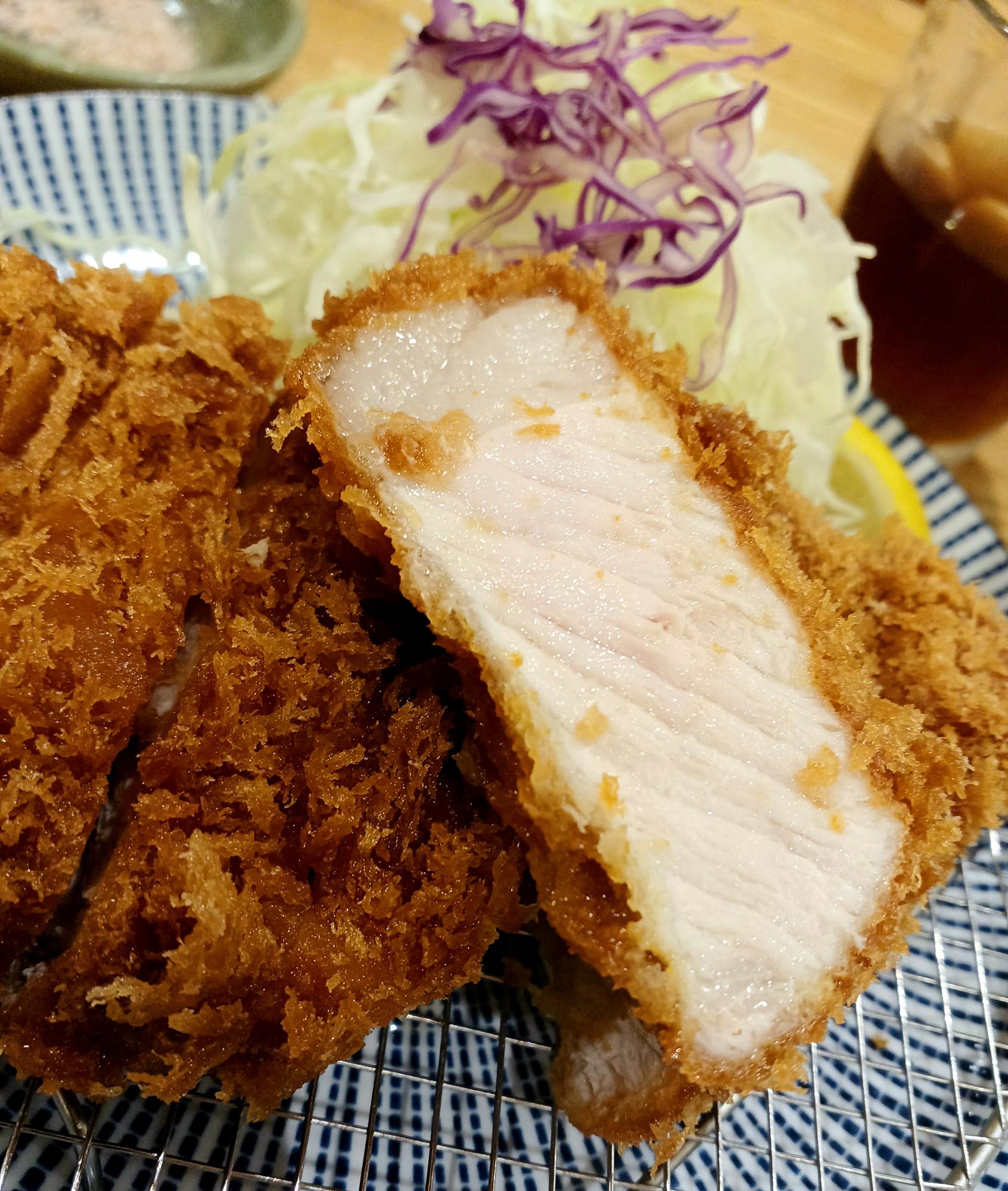 この肉厚の断面。アツアツのサクサクです。ボリュームがありながら、脂身のバランスがほどよく、箸が進みます。なんだか力が湧いてきた!