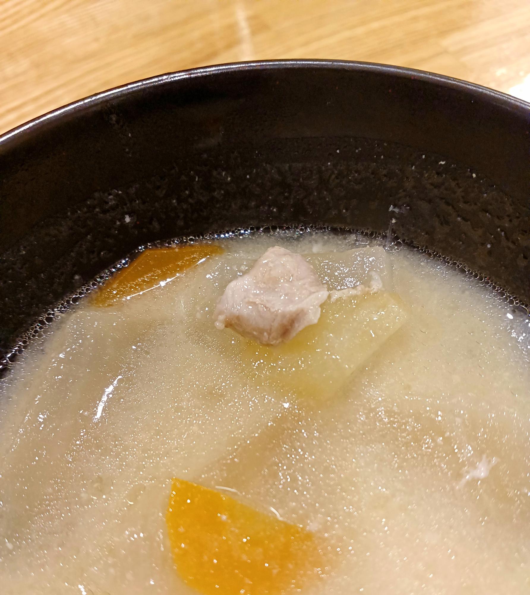 味噌汁にも、豚肉が入っています。大きめの大根、人参も。そしてショウガが効いていました。