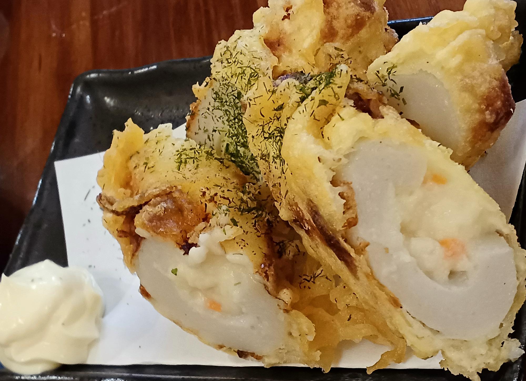 「ちくわサラダ」。サラダという名前だが、揚げ物。そして、ちくわの中にはポテトサラダが詰まっている。…えーい皆の者、酒を、酒を持つのじゃ!!