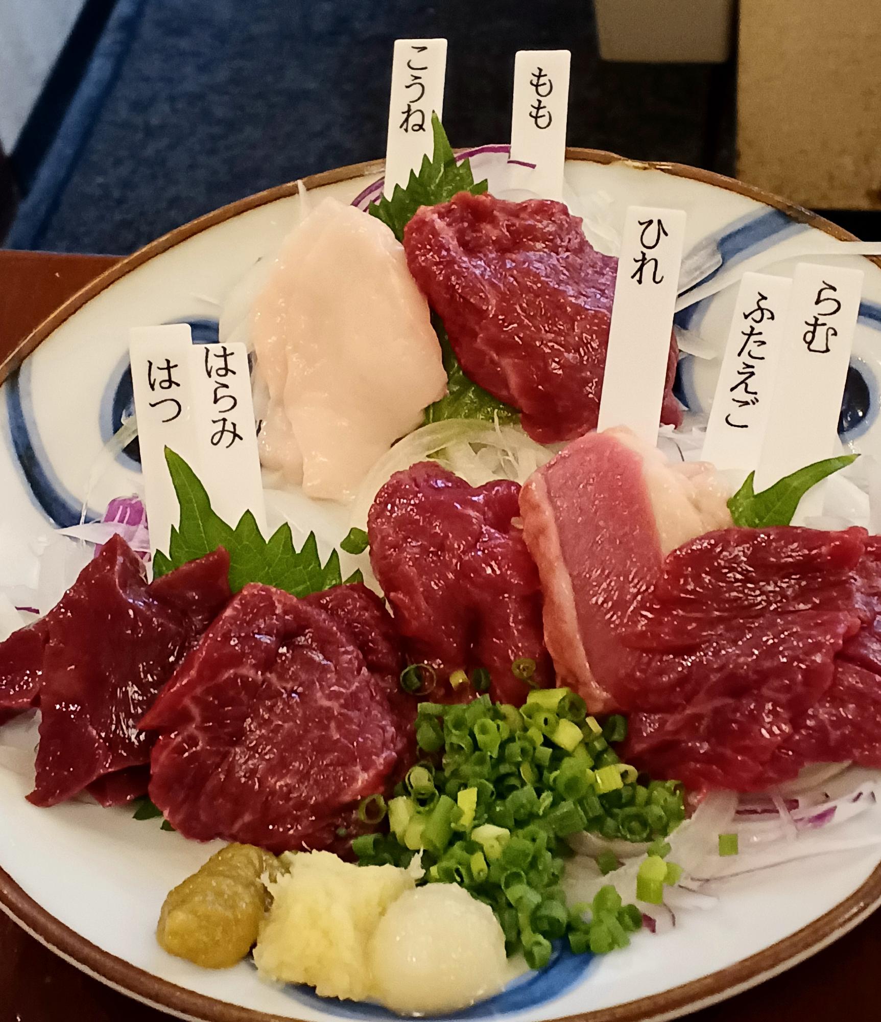 「はつ」「はらみ」「ひれ」「もも」は、焼き鳥や焼き肉でも馴染みがありますが、馬肉ならではの部位には、普段なかなか出会えないものも。「たてがみ」とも言う「こうね」、あばら近くの三層構造になっている「ふたえご」、お尻部分の「らむ」。食感や脂身の量がそれぞれに違って、馬の全身を味わうことができます。