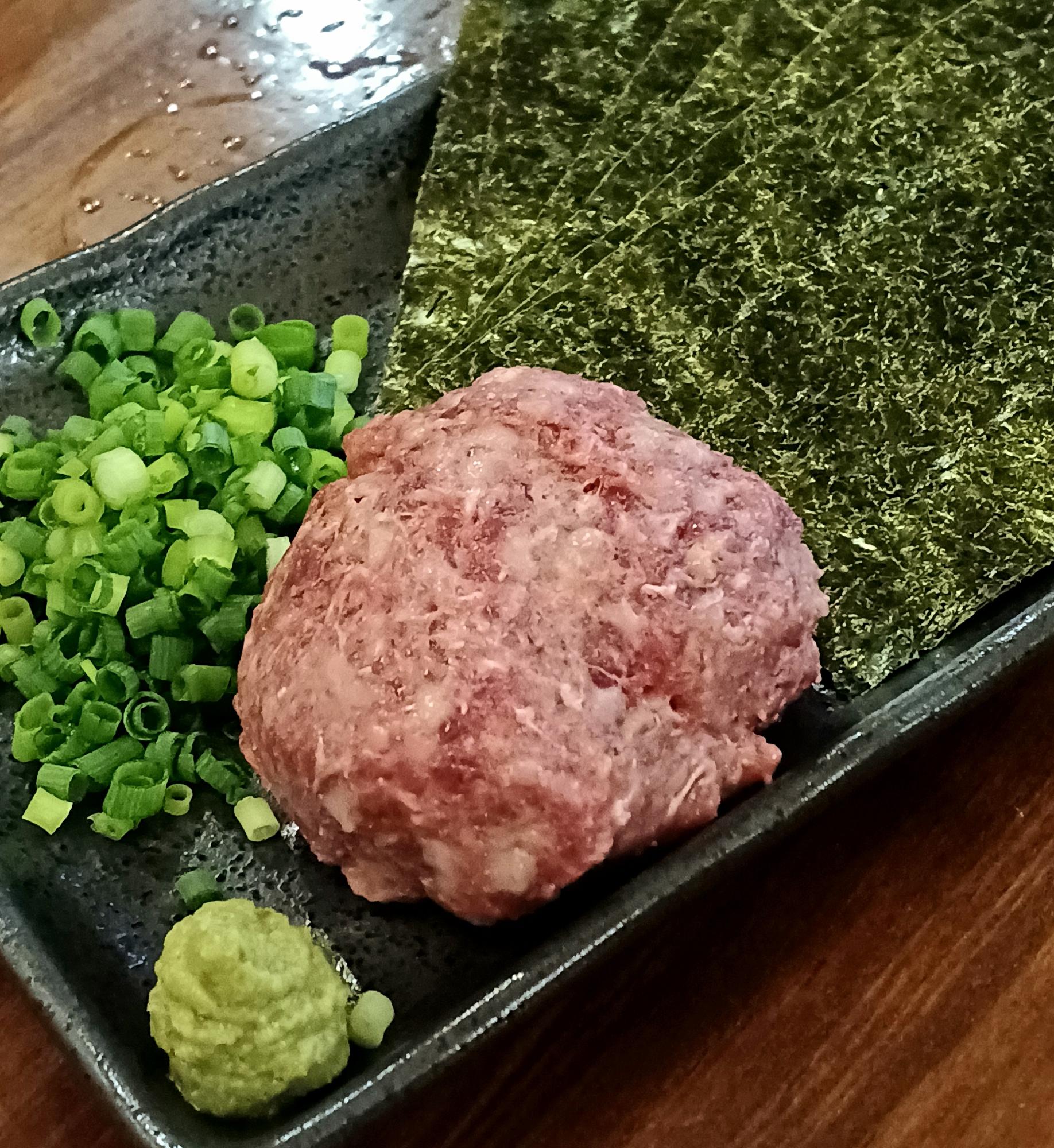 「馬肉のおつまみネギトロ」は、焼き海苔に挟みながら、ワサビ醤油でいただく。ネギトロには相違ないが、マグロとは違う。マグロよりも脂身でねっとりとしているようで、決してしつこくない濃厚な味わい。