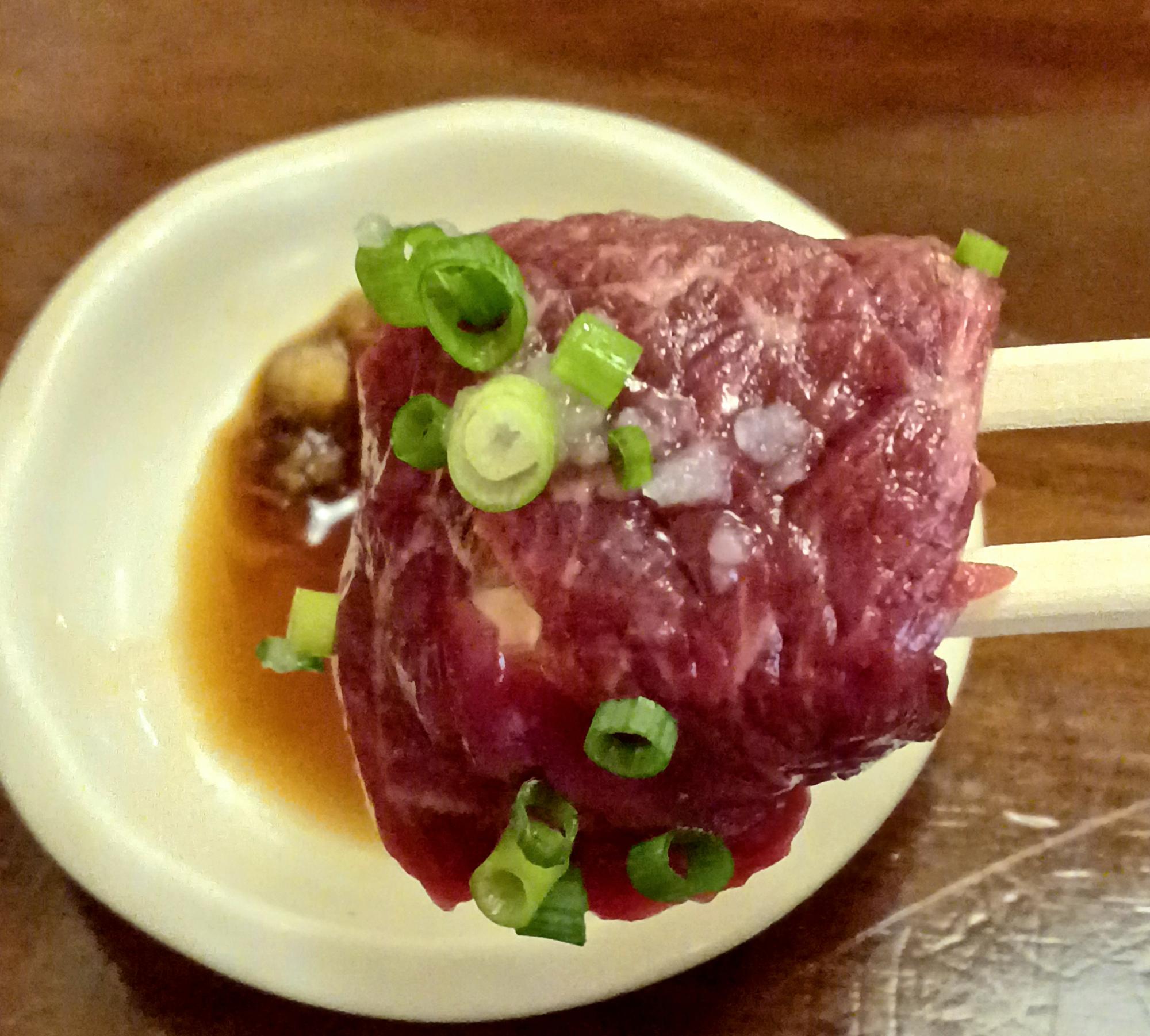 馬の「レバ刺し」。ゴマ油でいただく。専門店だからこそ安心していただける生食、新鮮さが印象的でした。