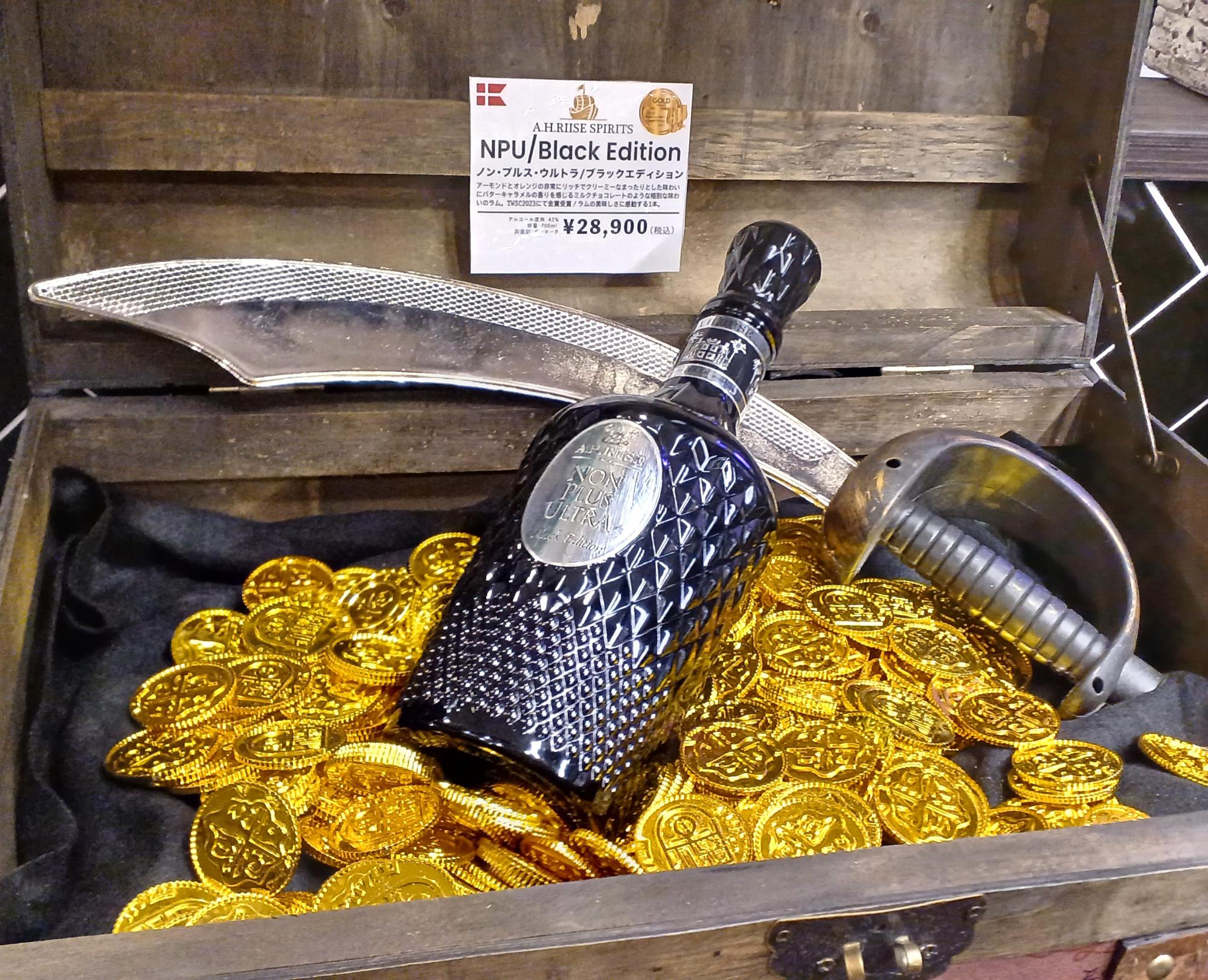 宝箱の中にディスプレイされているのは、デンマークの「A.H.RIISE SPIRITS(A.H. リーゼスピリッツ)」のラム。上質のミルクチョコレートのようなクリーミーな味わいだというこの一本は、お値段28,900円(税込)の高級品!