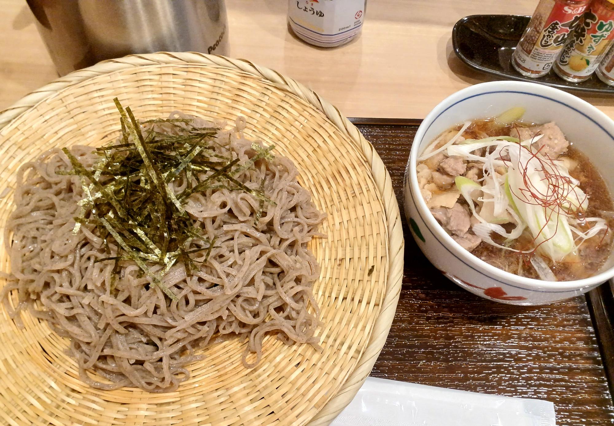冷たい蕎麦を、温かい出汁につけながらいただく、「つけ麺」スタイル。食べ応えはありながら「がっつり」とまではしておらず、蕎麦本来の健康的な味わいを楽しめる。時折、卓上の七味唐辛子をかけながら。
