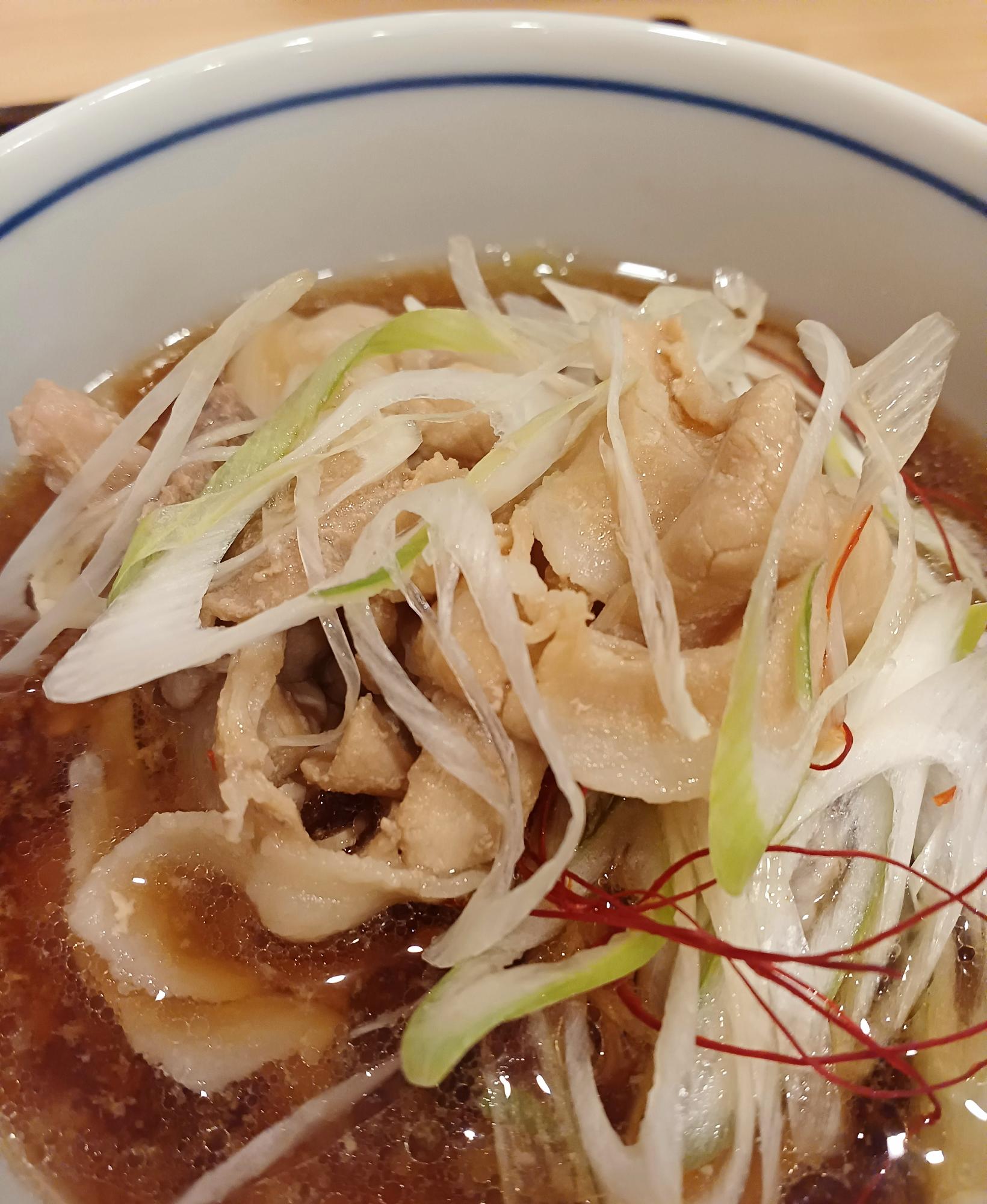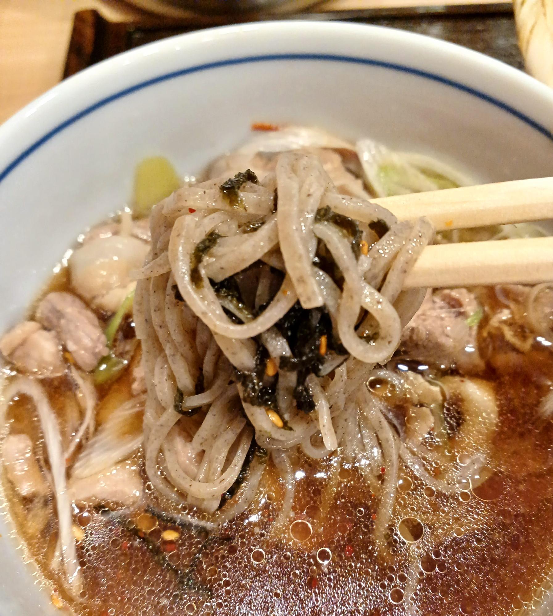 出汁となっている鴨に加えて、「鶏肉」か「豚肉」を選ぶことができ、写真は「豚肉」。肉はたっぷりと入っており、蕎麦の最後まで肉と一緒に楽しめた。