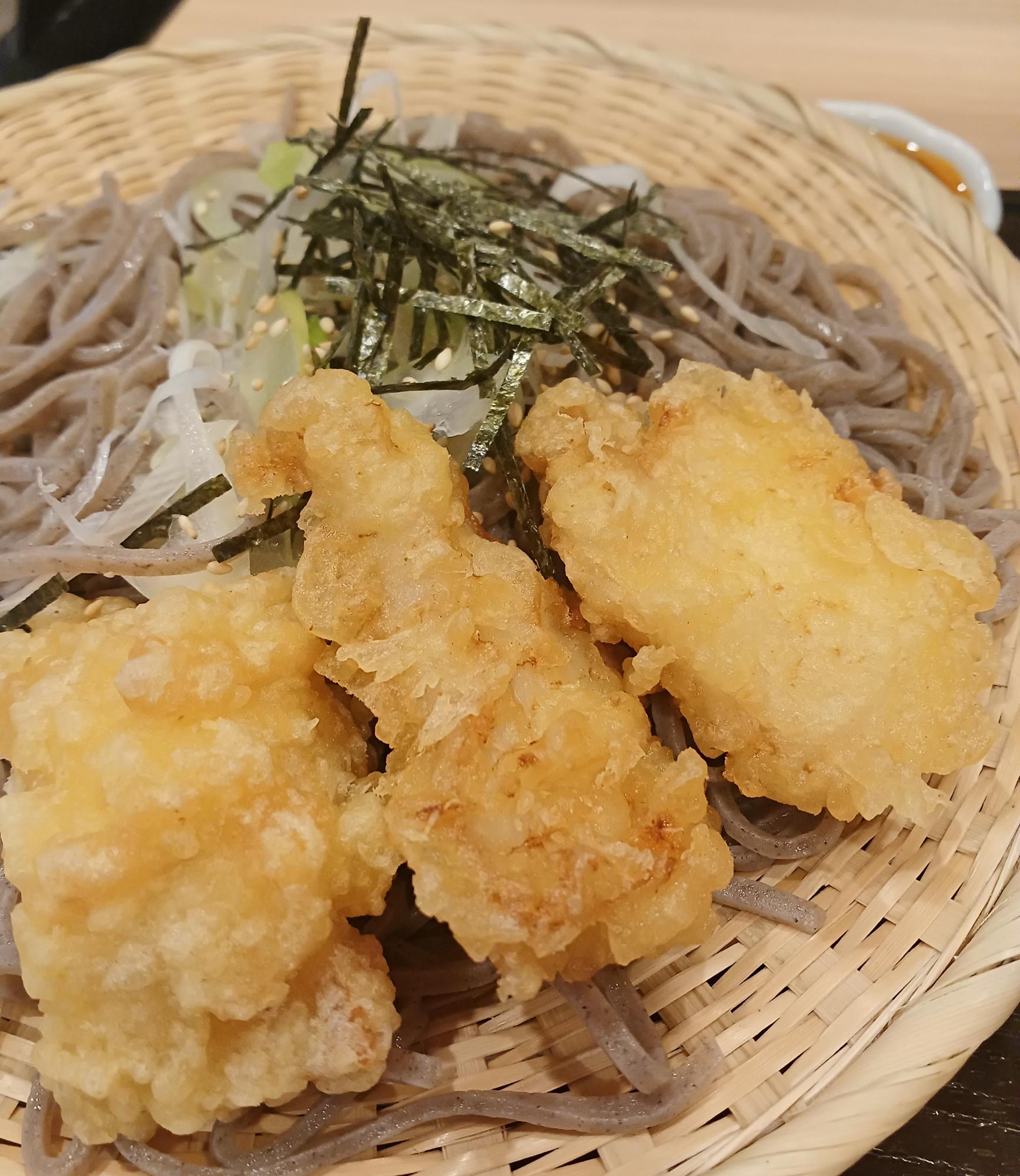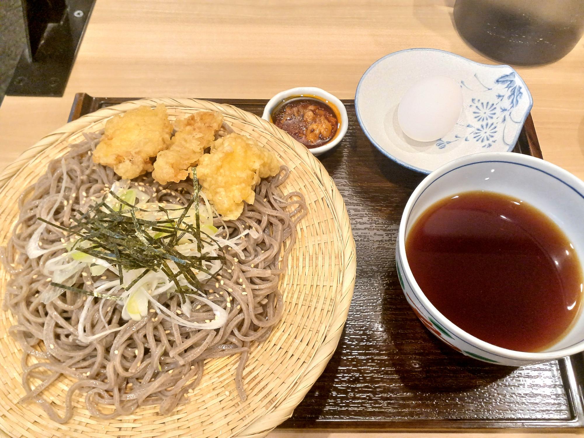 「らー油つけ蕎麦」の「鶏肉(鶏天)」。こちらも細麺で。写真奥の小皿がラー油で、これをそばつゆに入れる。