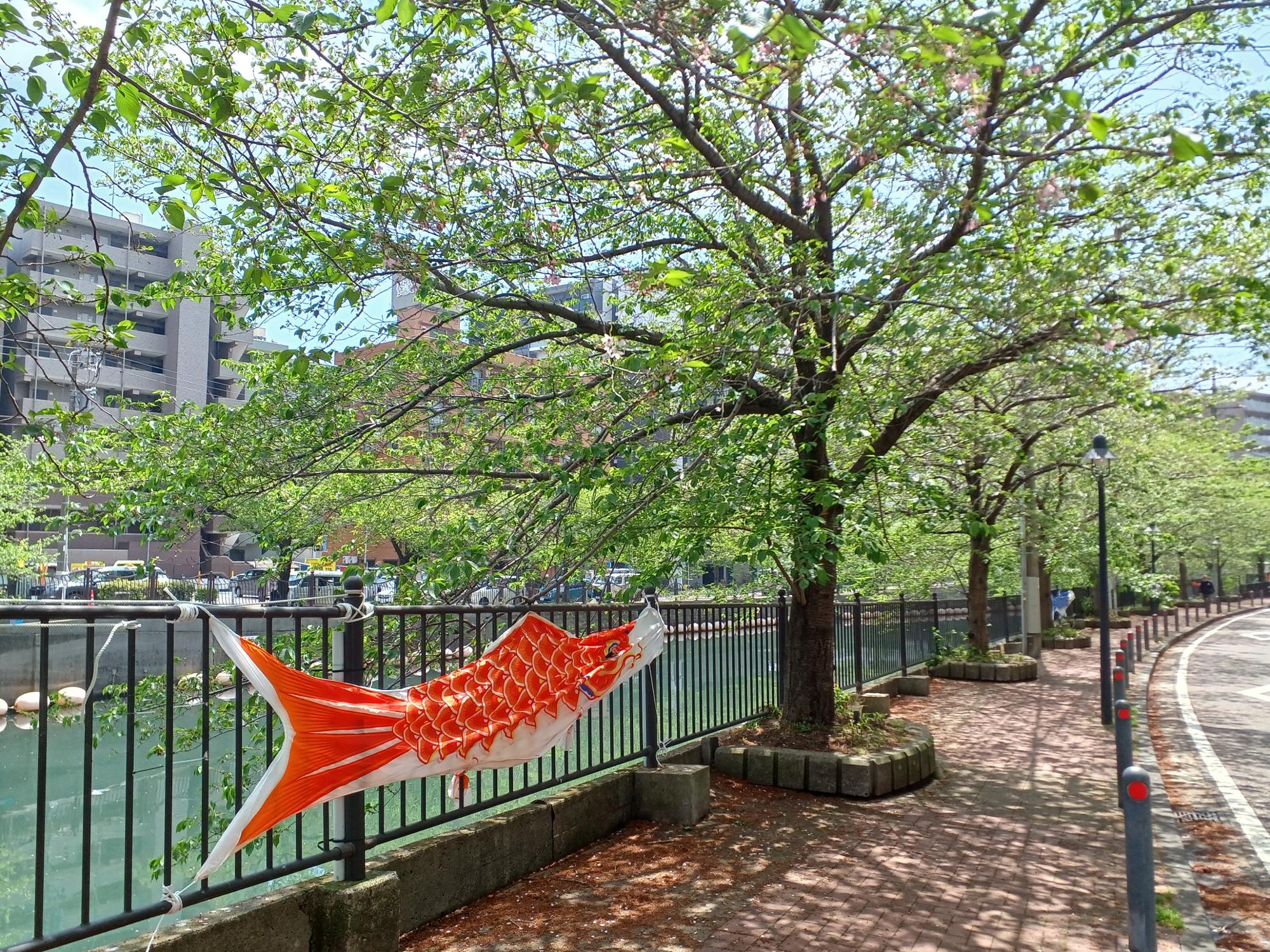 四月中旬。端午の節句に向けて、大岡川にも鯉のぼりが泳ぎます。