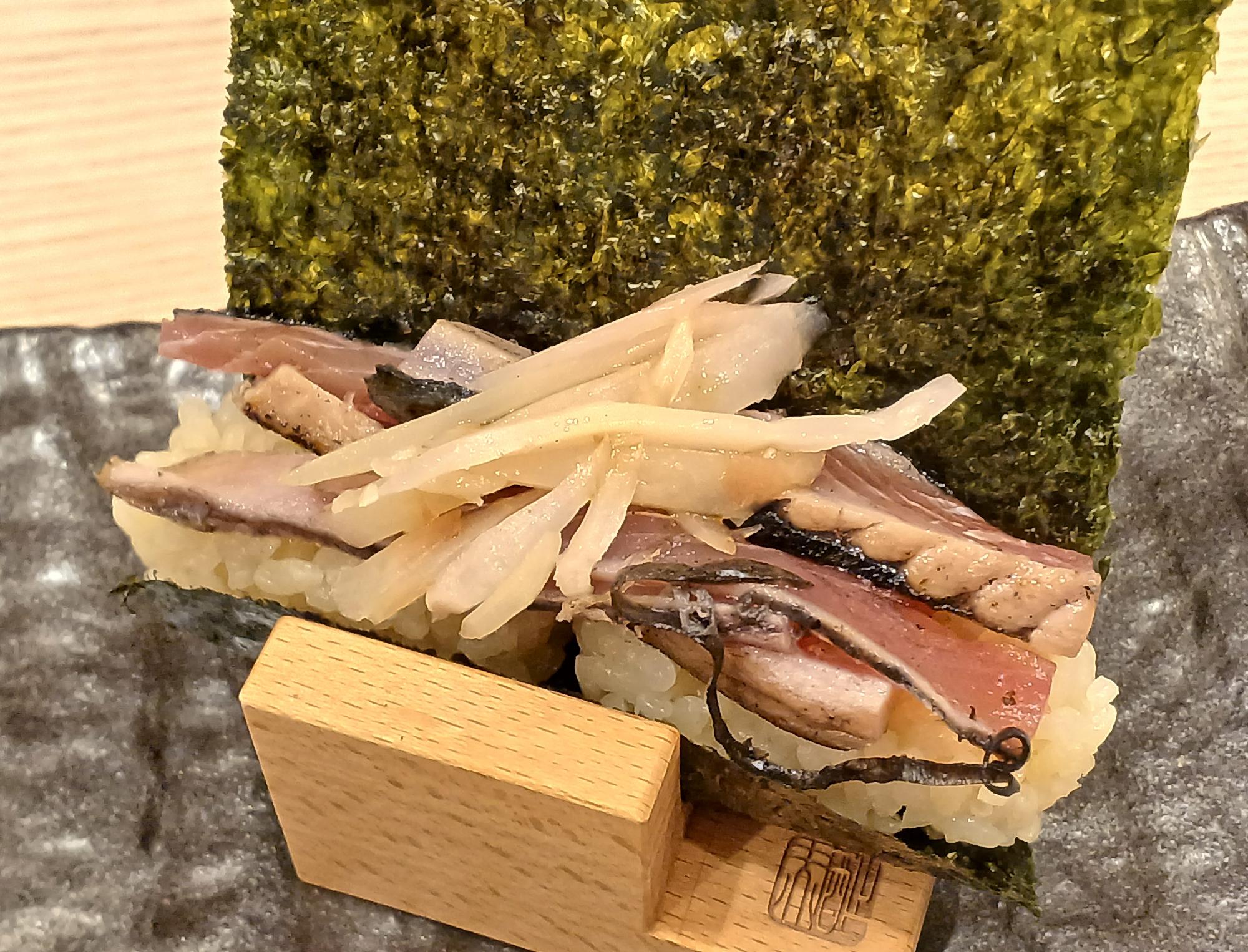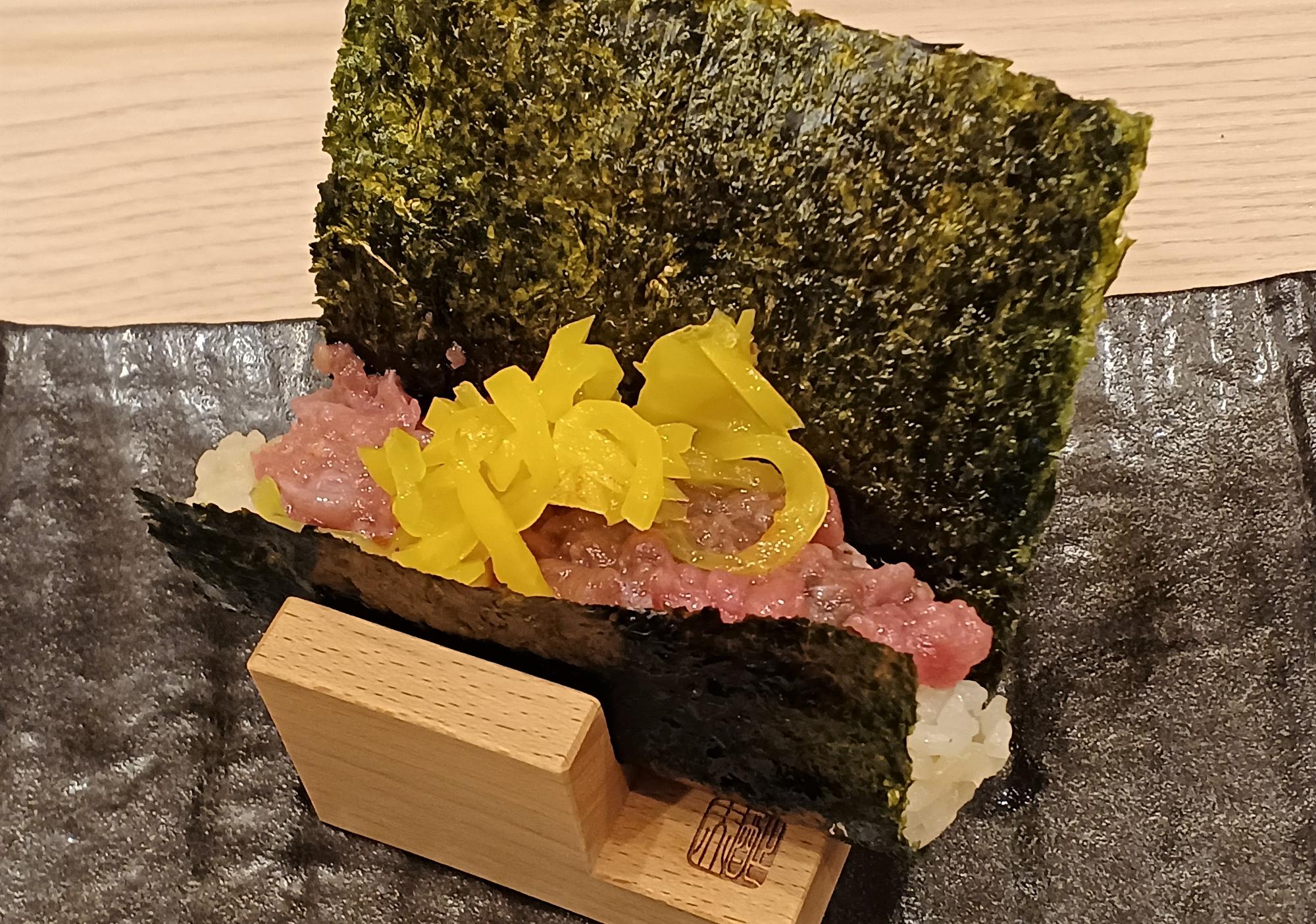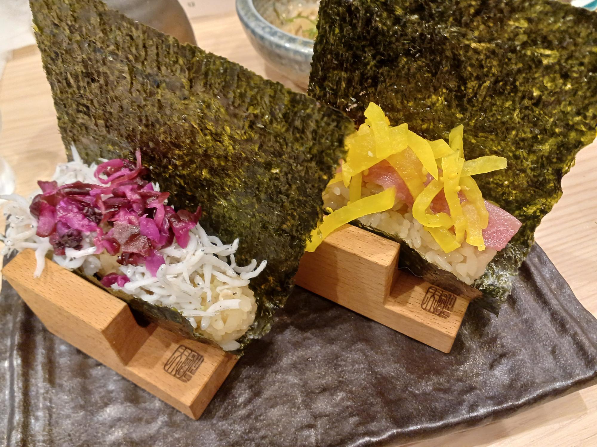 店名にもあるように海苔巻きもおすすめメニューで、写真のように大きめの海苔に包まれて提供されます。シャリの色が見えるでしょうか、赤シャリです。左はしらすと柴漬け、右はとろたく。