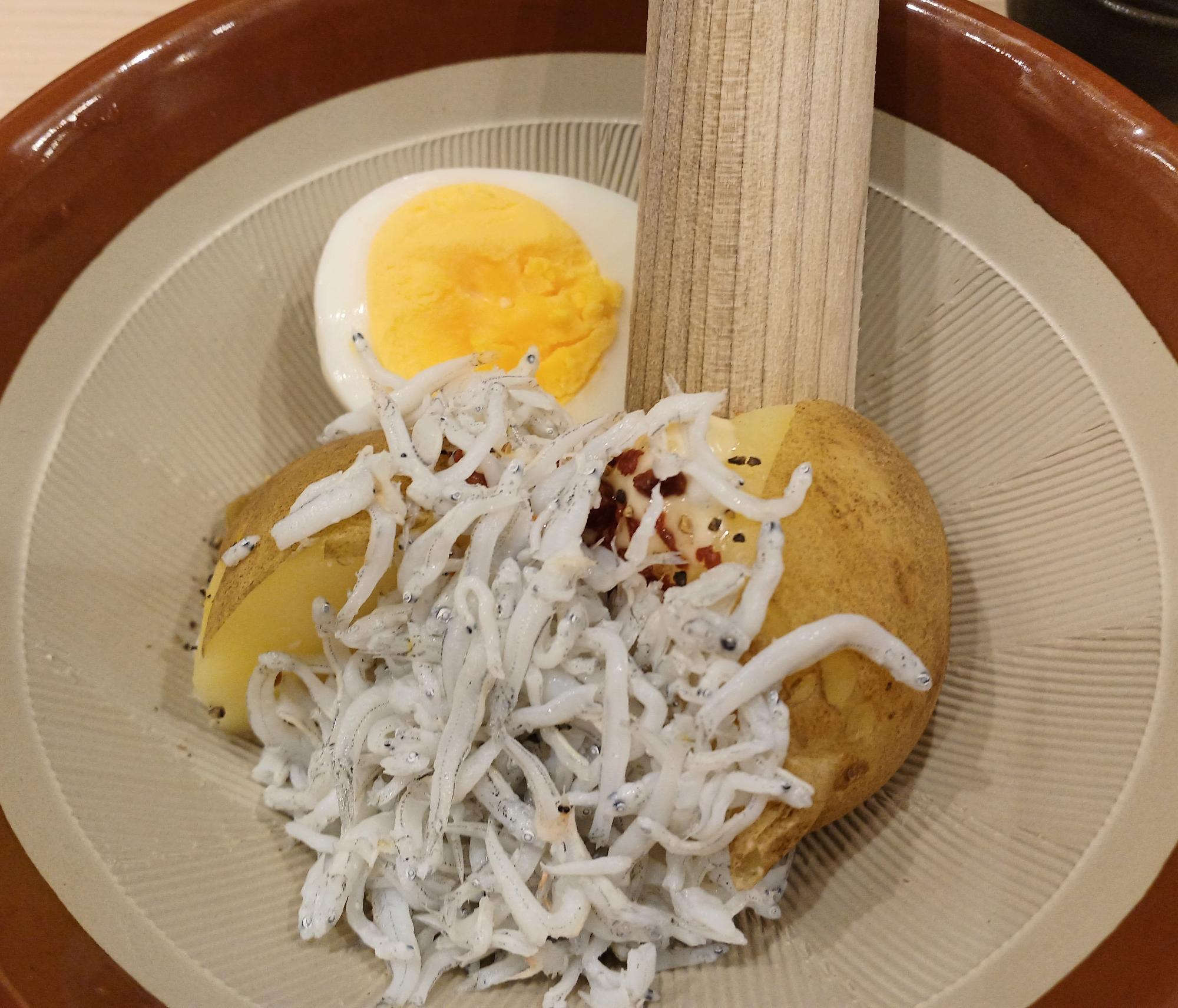 「ポテトサラダ(釜揚げしらす)」。食べる直前に、すり鉢でつぶして作るスタイル!ヘルシーな味わいで、カリカリのベーコンもアクセントになっています。