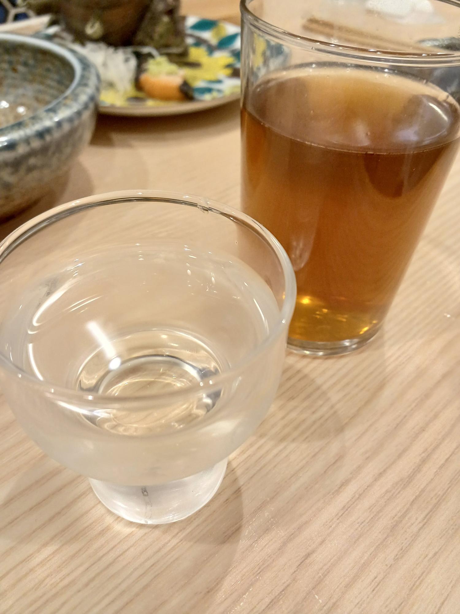 日本酒を「出し割」とともに。日本酒は安いもので500円(税抜)から。プレオープン中はこれが半額だから…かなりお得だ!