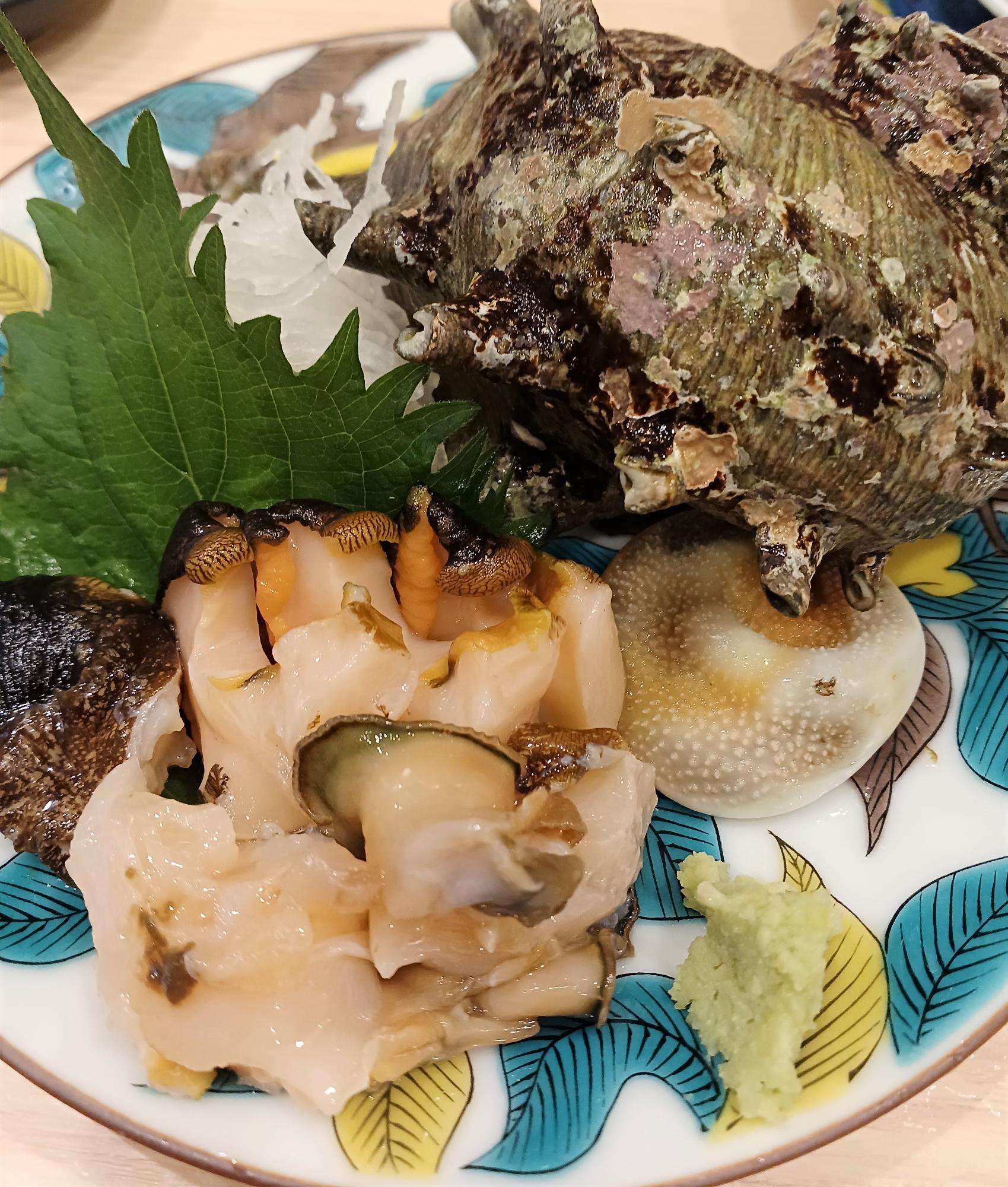 牡蠣、赤貝、さざえ、みる貝など、ショーケースや水槽にたくさんの貝!先ほどまで生きていた、「活さざえ」。コリコリです。