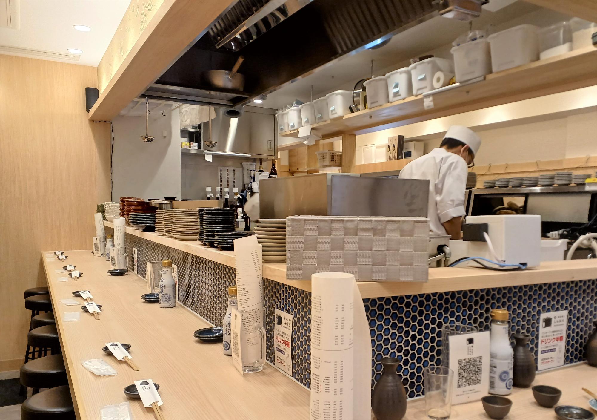 オープンから間もない店舗でありながら、キッチンもうまく効率化されている印象です。そして何より、新鮮なネタをぱっとつまめるのが良い。カウンター席を中心に、通りに面したテーブル席、店内奥には個室のテーブル席も。