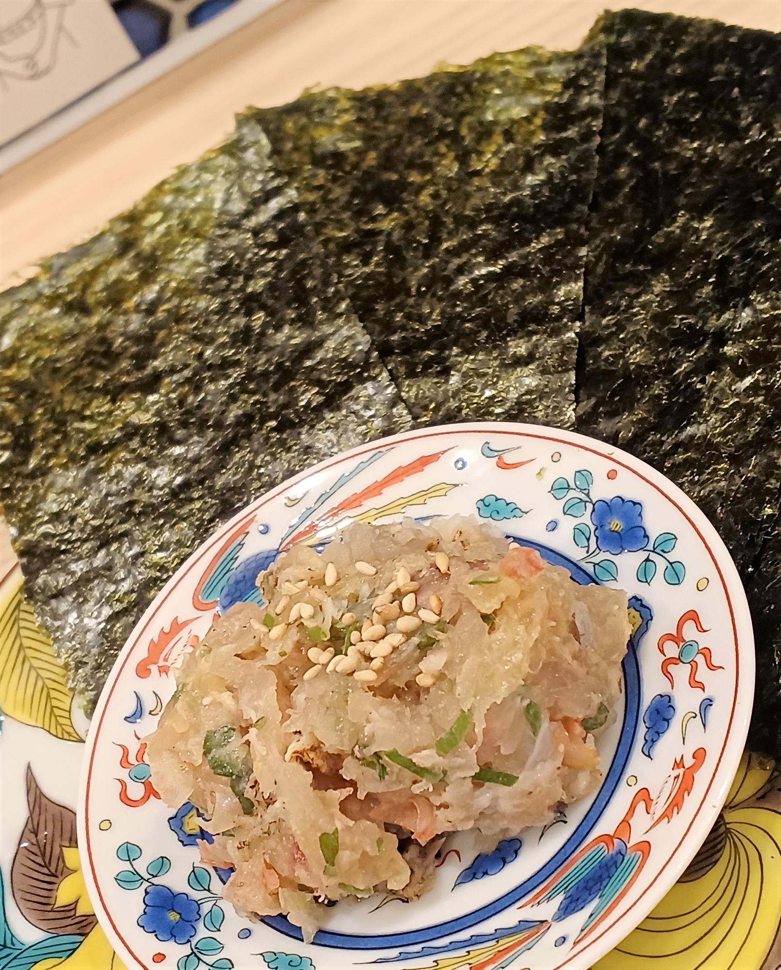 海苔に包んでいただく、なめろう。