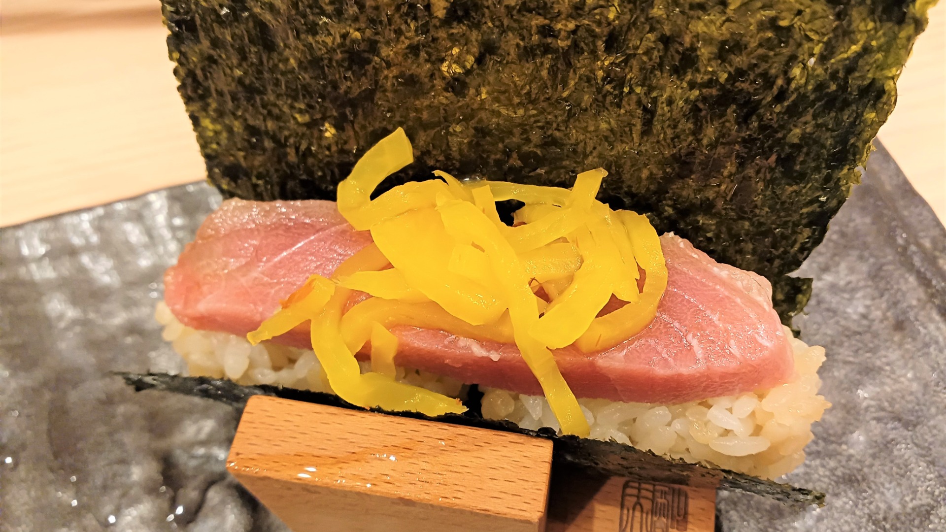 店名にもあるように海苔巻きもおすすめメニューで、写真のように大きめの海苔に包まれて提供されます。シャリの色が見えるでしょうか、赤シャリです。左はしらすと柴漬け、右はとろたく。