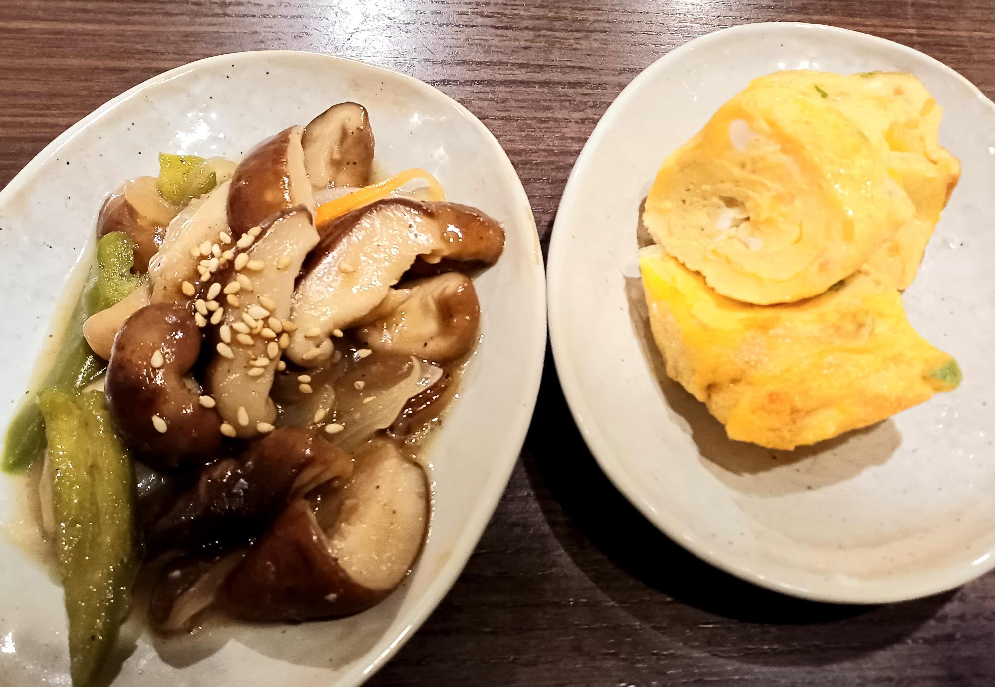 こちらはお通しで出た小皿2品。左はシイタケをメインに、ピーマンやたまねぎ、にんじんも入ったコショウ味の一品、なんだかヘルシーでうれしい。