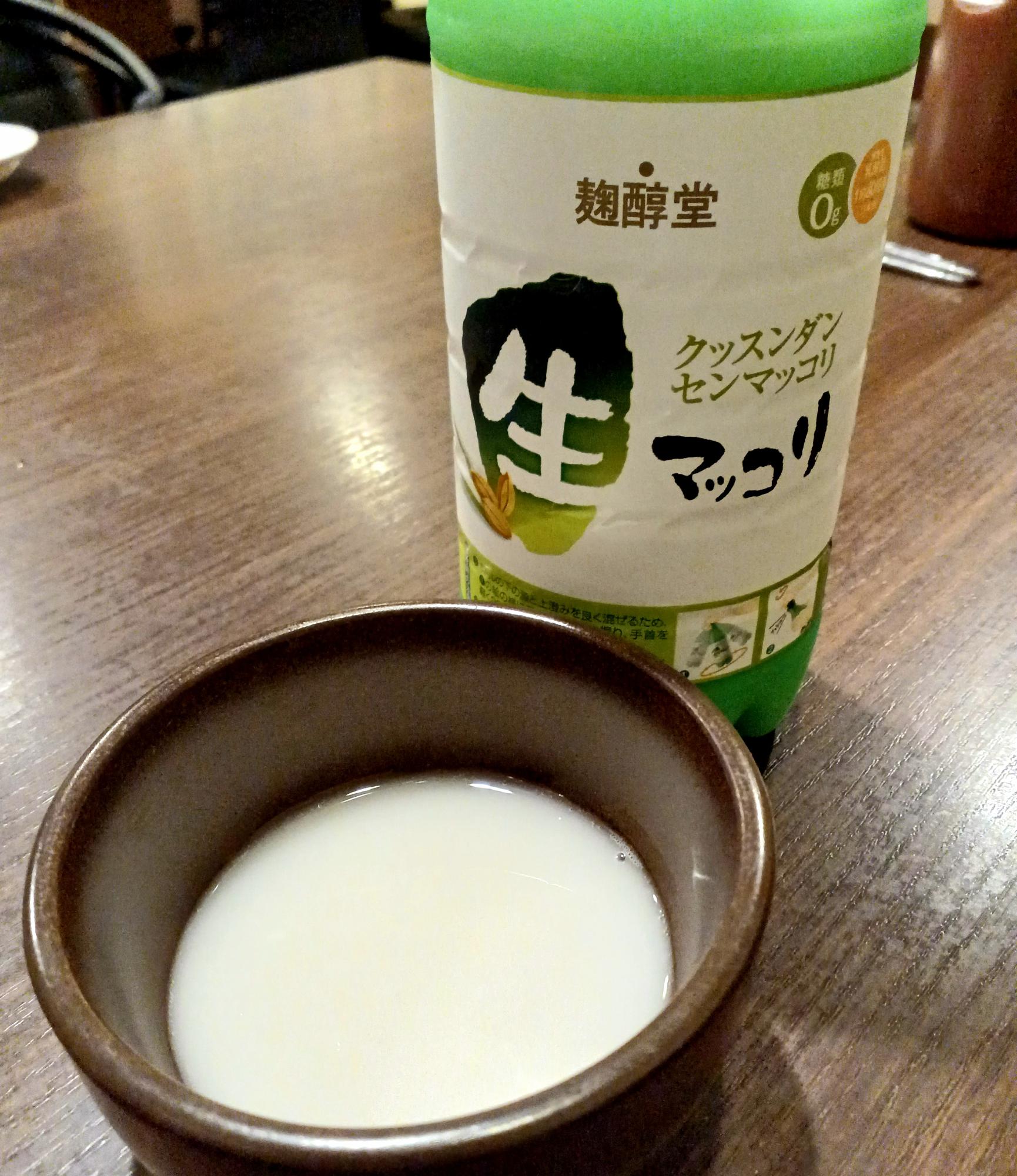 今宵のお供は、生マッコリ(センマッコリ)。中身を上下して混ぜて「30秒待ってから開ける」とのこと。待たないと…おそらくマッコリがボトルから吹き出します!甘すぎず飲みやすい。